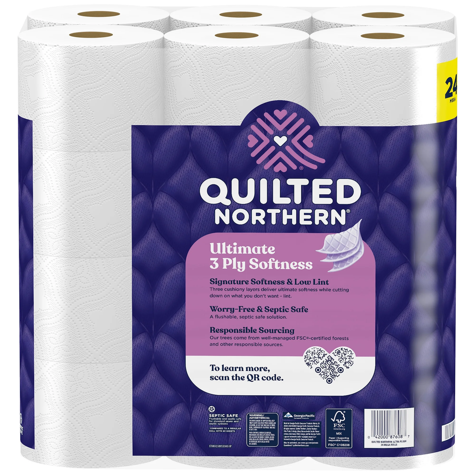 Bring elevated comfort to your bathroom with Quilted Northern Ultra Plush toilet paper. Each roll is crafted with three cushiony layers to deliver a soft, cozy feel every time. It?s 3X thicker and 3X more absorbent than the leading value brand toilet paper, giving you the signature softness you love while reducing what you don?t?lint! Made from responsibly sourced trees, it?s a choice you can feel good about. Each pack includes 24 Ultra Plush rolls, with 255 3-ply sheets per Mega Roll? totaling 6,120 sheets!