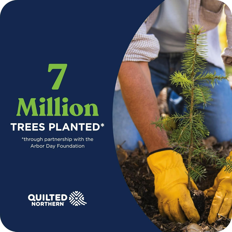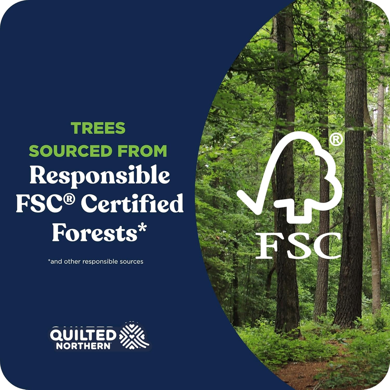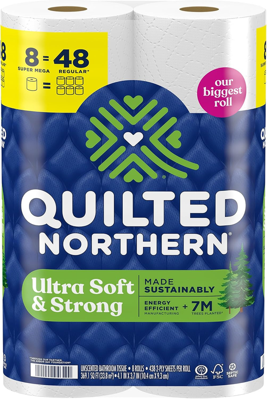 Quilted Northern Ultra Soft Strong Toilet Paper is thoughtfully designed to deliver softness, strength, and sustainability in every roll. Each premium 2-ply sheet is 5X stronger when wet than the leading value brand and made using energy-efficient technology and responsible manufacturing practices. We source our materials from well-managed FSC certified forests, and through our partnership with the Arbor Day Foundation, two trees are planted for every one used. This pack includes 8 Super Mega Rolls, each with 438 sheets?adding up to 3,504 sheets total. That?s equal to 48 regular rolls, so you won?t have to change the roll as often.
