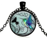 Una capsula rotonda con arte di un colibrì con sfondo. Come una foto di un colibrì volante nel suo ambiente con cielo e boschi sullo sfondo. Una capsula di vetro a bolle montato con una base di ottone o alluminio. Tutto fatto con una catena nera di 18 pollici. Bella scena.