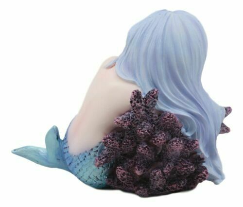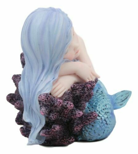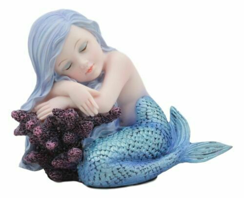 • If you are a big mermaid fan or know someone who loves mermaids, you will love this figurine! It features a beautiful young mermaid with a unique blue aquamarine tail sleeping on coral reef.