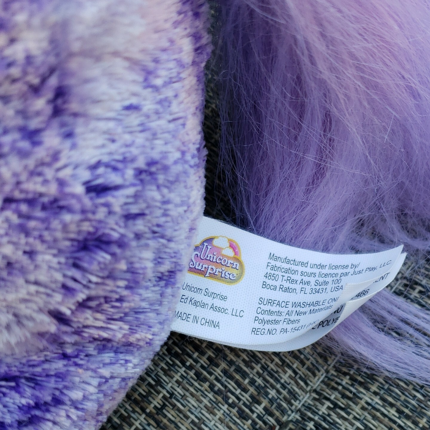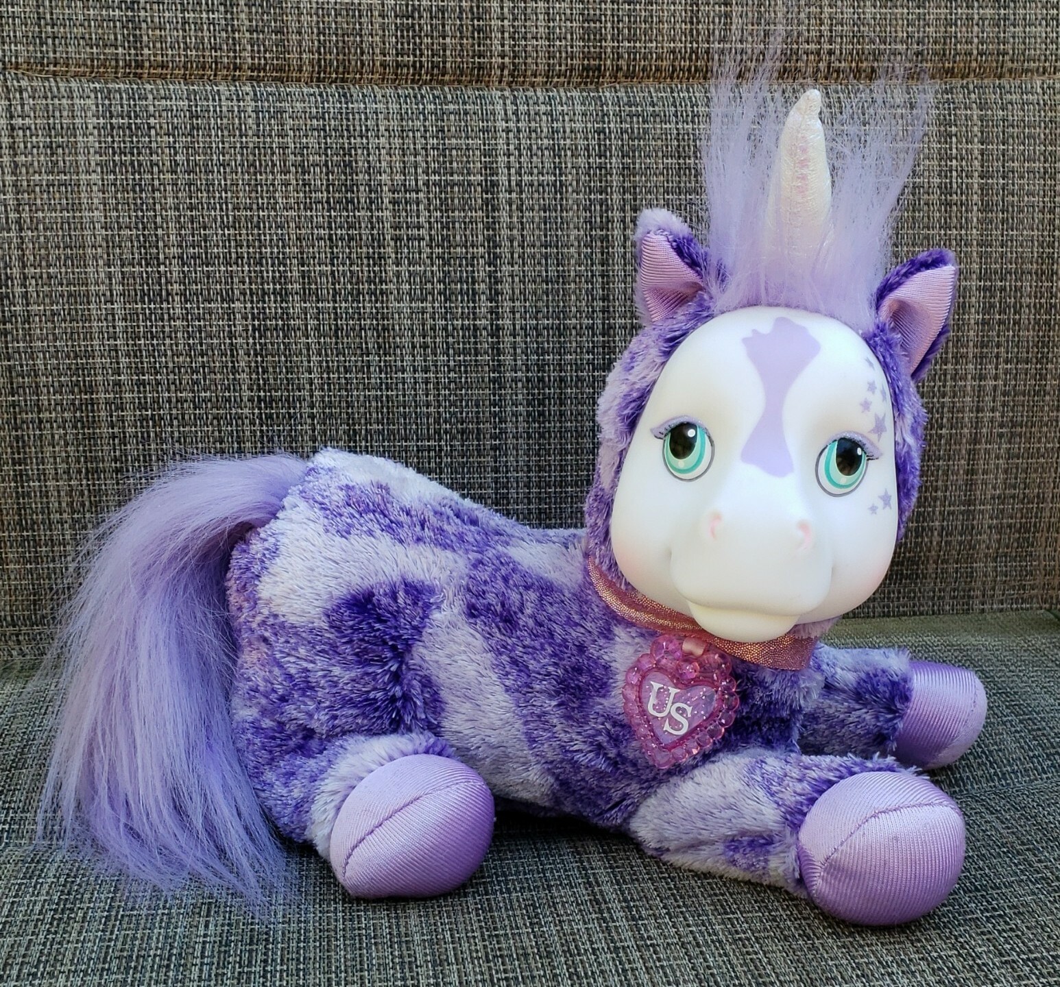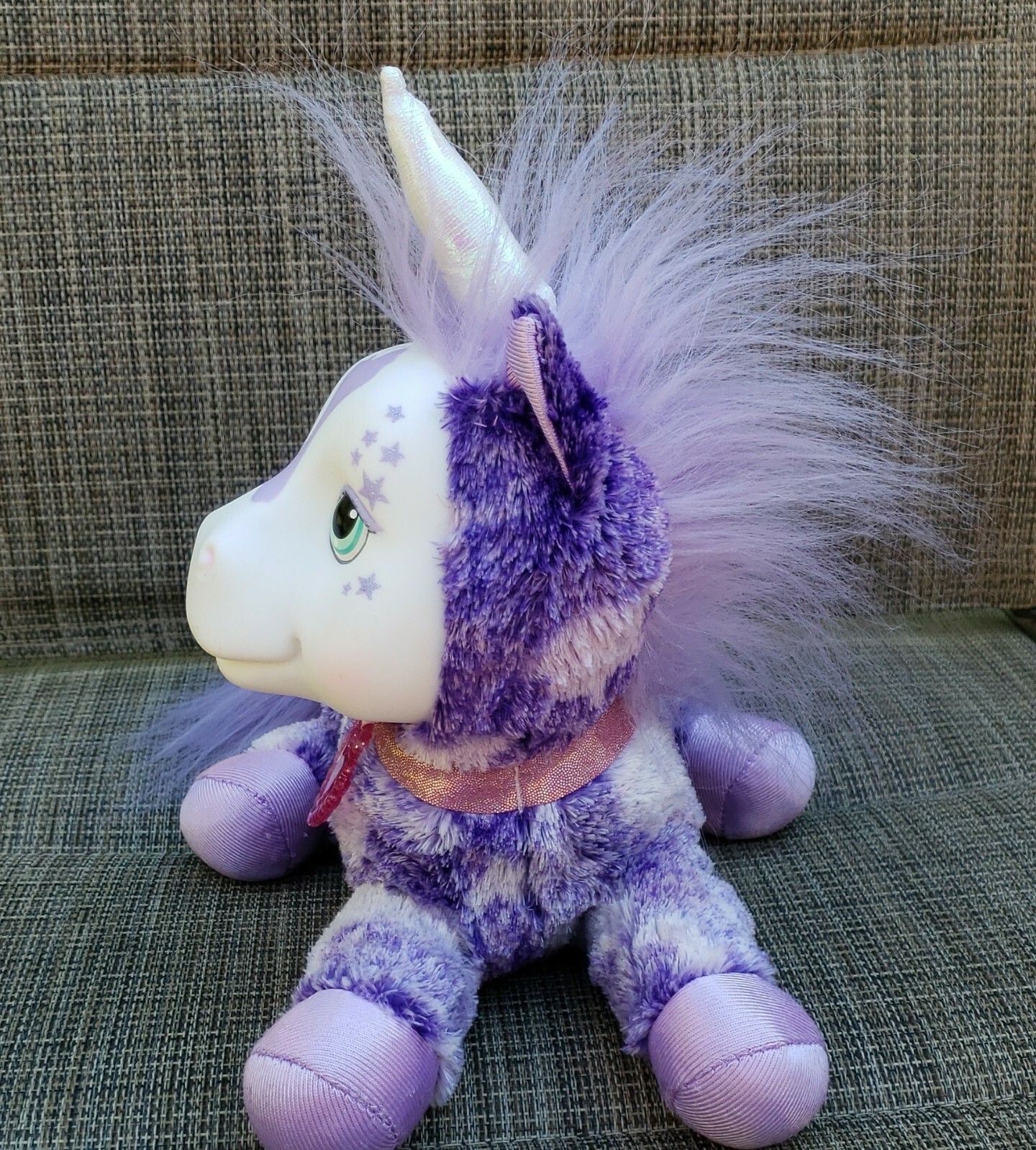 2019 Unicorn Surprise; purple plush body with hard plastic face which has Purple Stars along temple. White shiny horn!