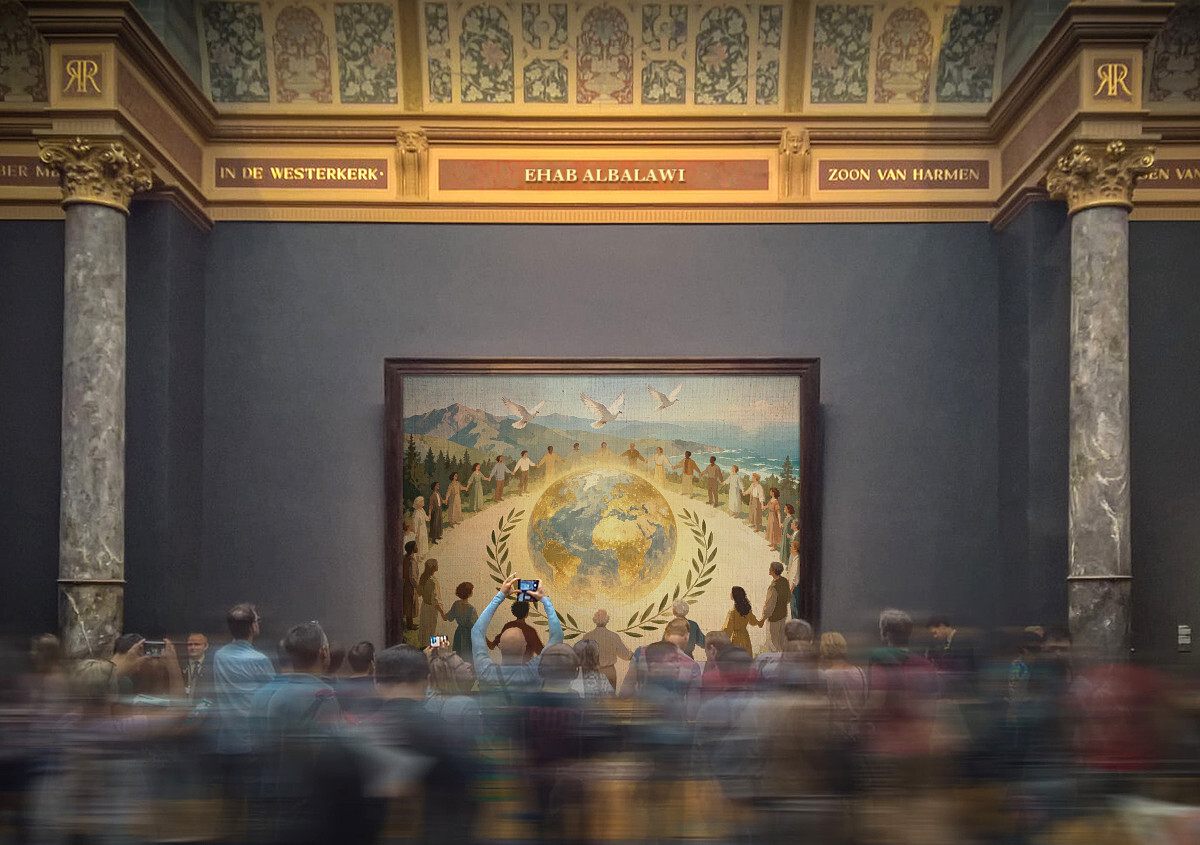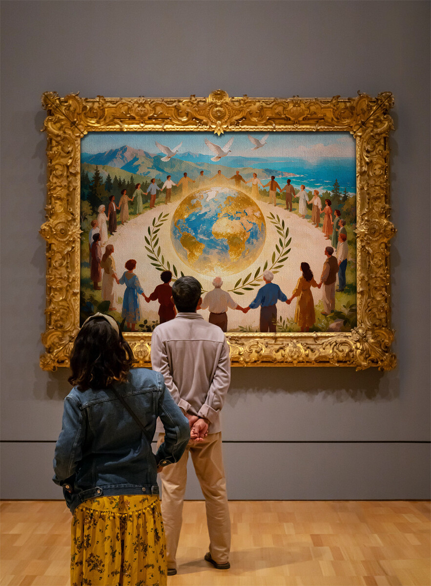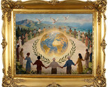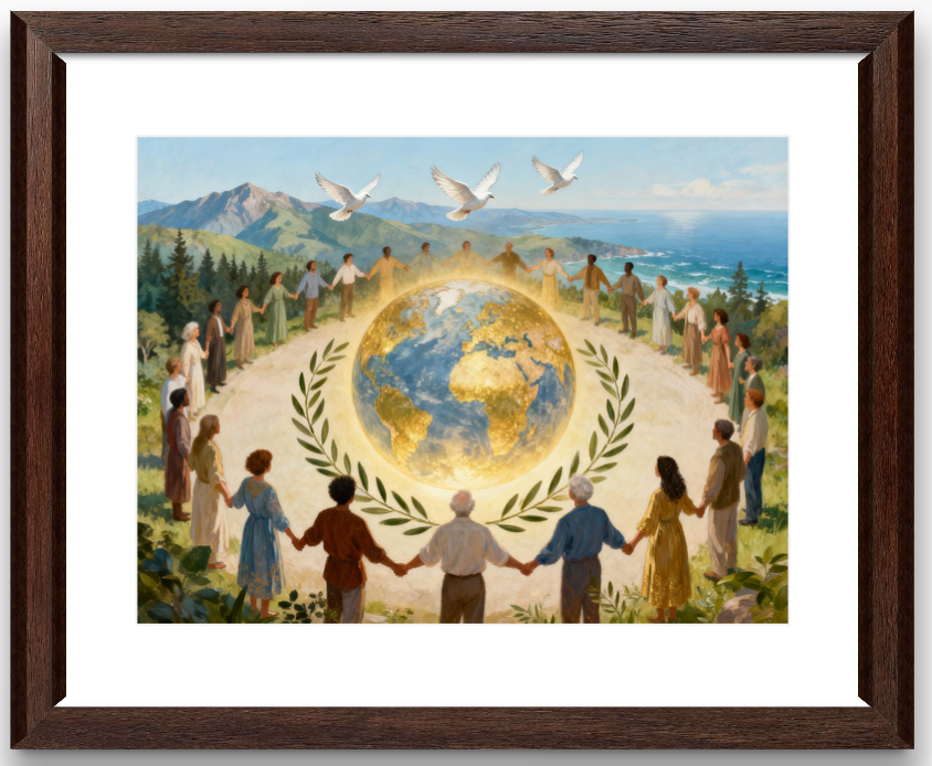 Experience a moment of serenity and unity in this breathtaking digital painting, where people from all walks of life encircle a radiant golden globe, set amidst lush landscapes and sweeping views of mountains and sea. White doves soar overhead as universal symbols of peace, while golden laurel leaves crown the scene, celebrating victory and lasting hope.