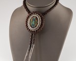 Comprend un bolo unique avec plaque en cuir, une bordure en cuir tressee et une lunette argentee autour de la piece maîtresse tissee