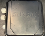 This listing is for a used Unirac Solobox junction box, complete with a pre-installed DIN rail and three included conduit fittings: one Halex 3/4" Y 2, one Halex 3/4" Y 1, and one Rain Tight 7 threaded connector. The Solobox features a NEMA 3R enclosure for weather resistance, flexible conduit entry points on all sides, and easy installation for solar or electrical projects.