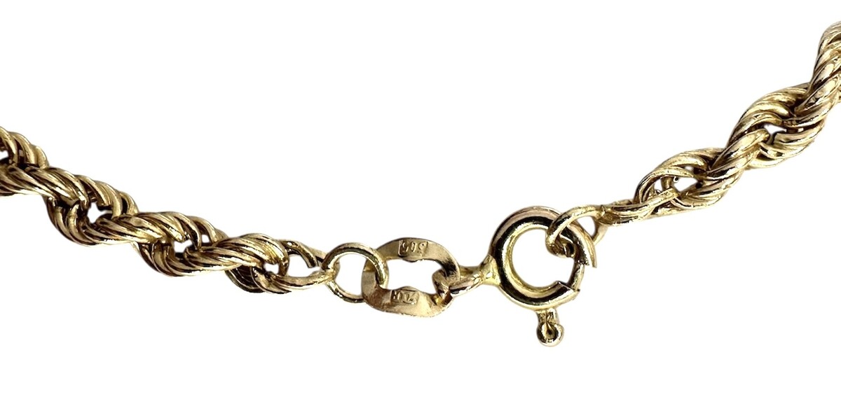 Type: ChainWeight: 3.1Karat: 14ktMetal: Yellow GoldGender: UnisexStyle: RopeSize / Length: 19"Owner applied: 585 ROORCondition:Used