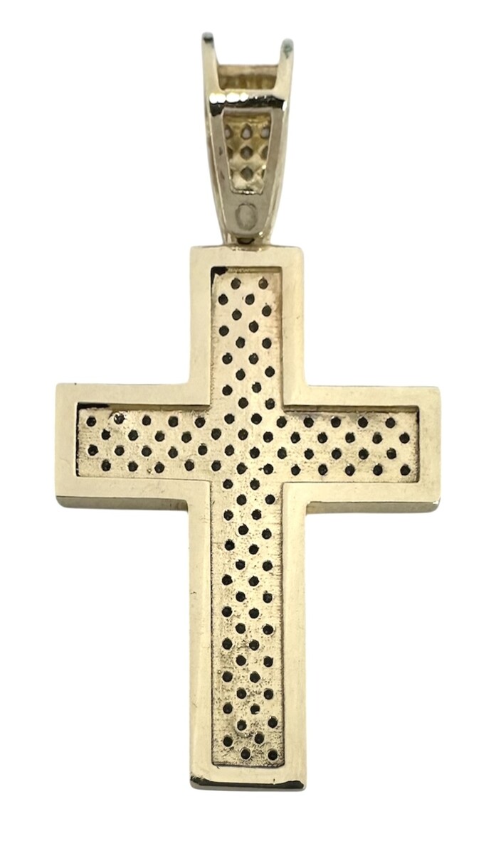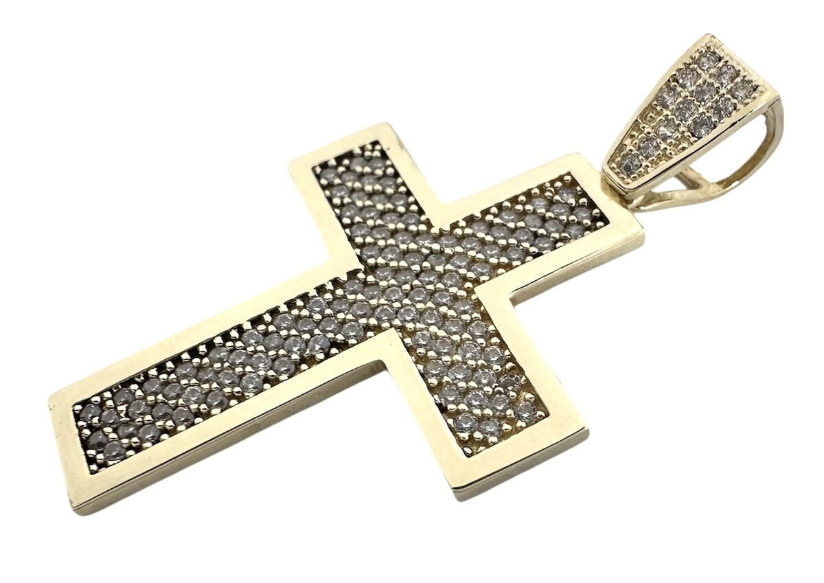 Type: CharmWeight: 3.6Karat: 14ktMetal: Yellow GoldGender: UnisexStyle: CrossSize / Length: 1 3/4"Owner applied: noneStone 1 quantity: 100Stone 1 shape: RoundStone 1 color: ClearStone 1 weight (total): 1.00Stone 1 type: Cubic ZirconiaCondition:Used