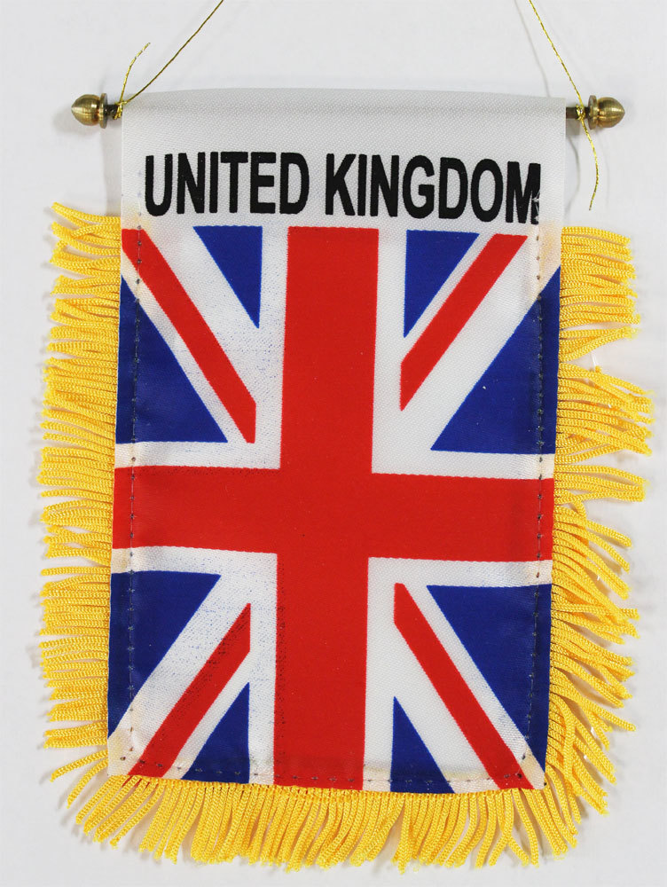 We are pleased to provide a selection of United Kingdom window-hanging flags, perfect for display in your vehicle. These are approx. 4.5" x 4" flags with fringed edges and a gold rope which attaches to the supplied suction hanger, or mounts directly over your rear-view mirror.
