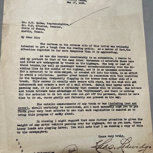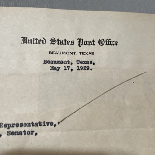 United States Post Office Letter 1935 Beaumont Texas to State Representative.