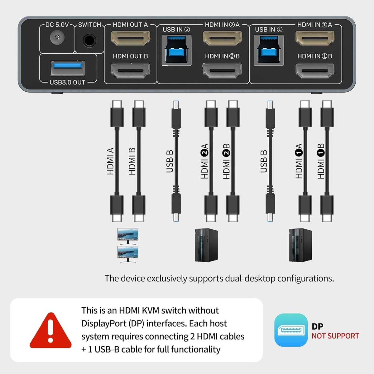 USAGE INSTRUCTIONS: This product is designed for use with desktop hosts only.The included USB A-to-B cable must be used. If HDMI and DP video outputs are required simultaneously, both host devices must have all necessary cables connected, including the USB B cable, HDMI cable.