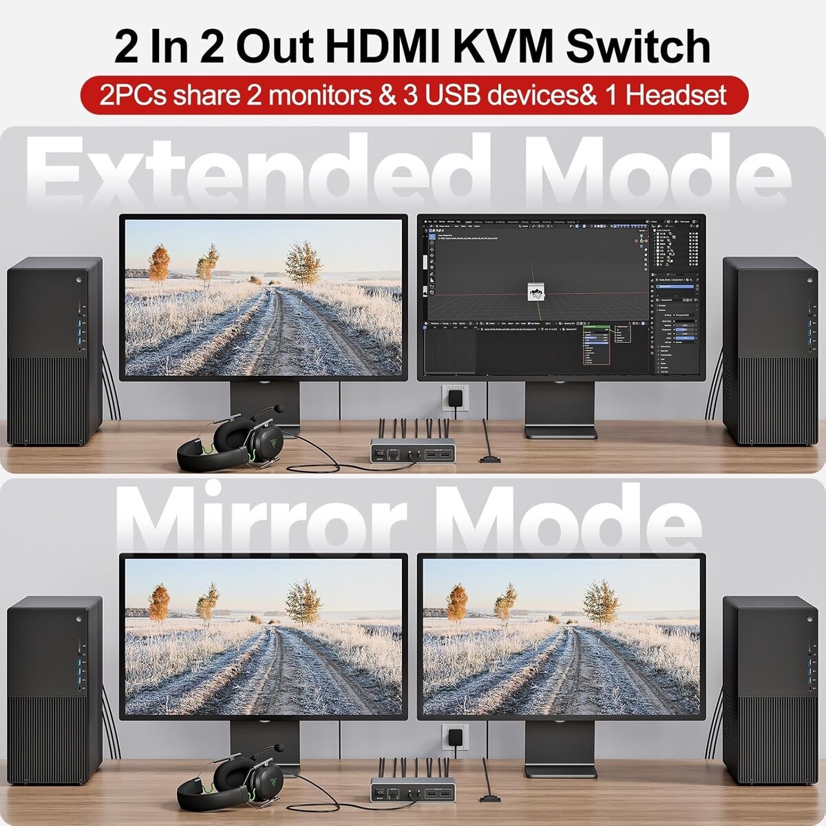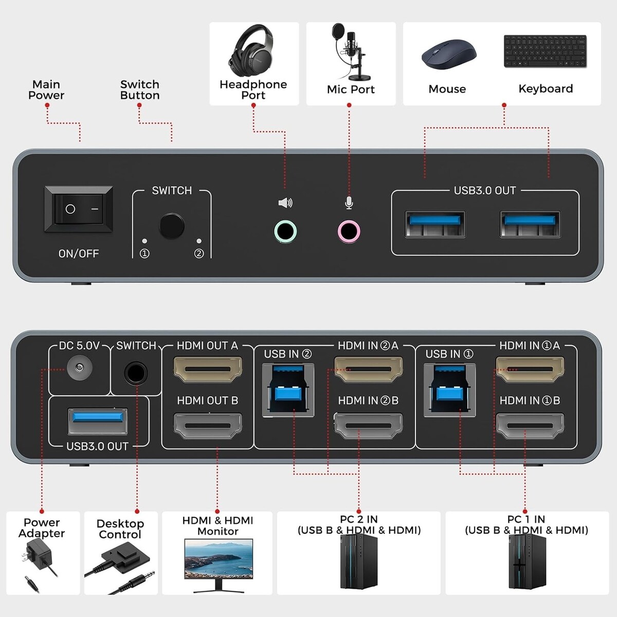 ?HDMI 2 IN 2 OUT KVM Switch ?Compatible with HDMI video sources only.The Unitek HDMI KVM Switch lets you connect two computers to dual monitor and 3 USB 3.0 devices, such as a keyboard, mouse, hard drives, U disk, and printer. This KVM switch is also compatible with a wide range of input devices, including PCs and even PS4, and supports multiple operating systems like Windows 7/8/10/11/Vista/XP, Linux, Mac, and more.Mic and headset port support more function.