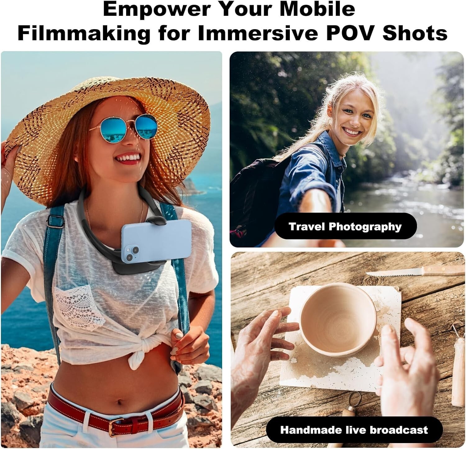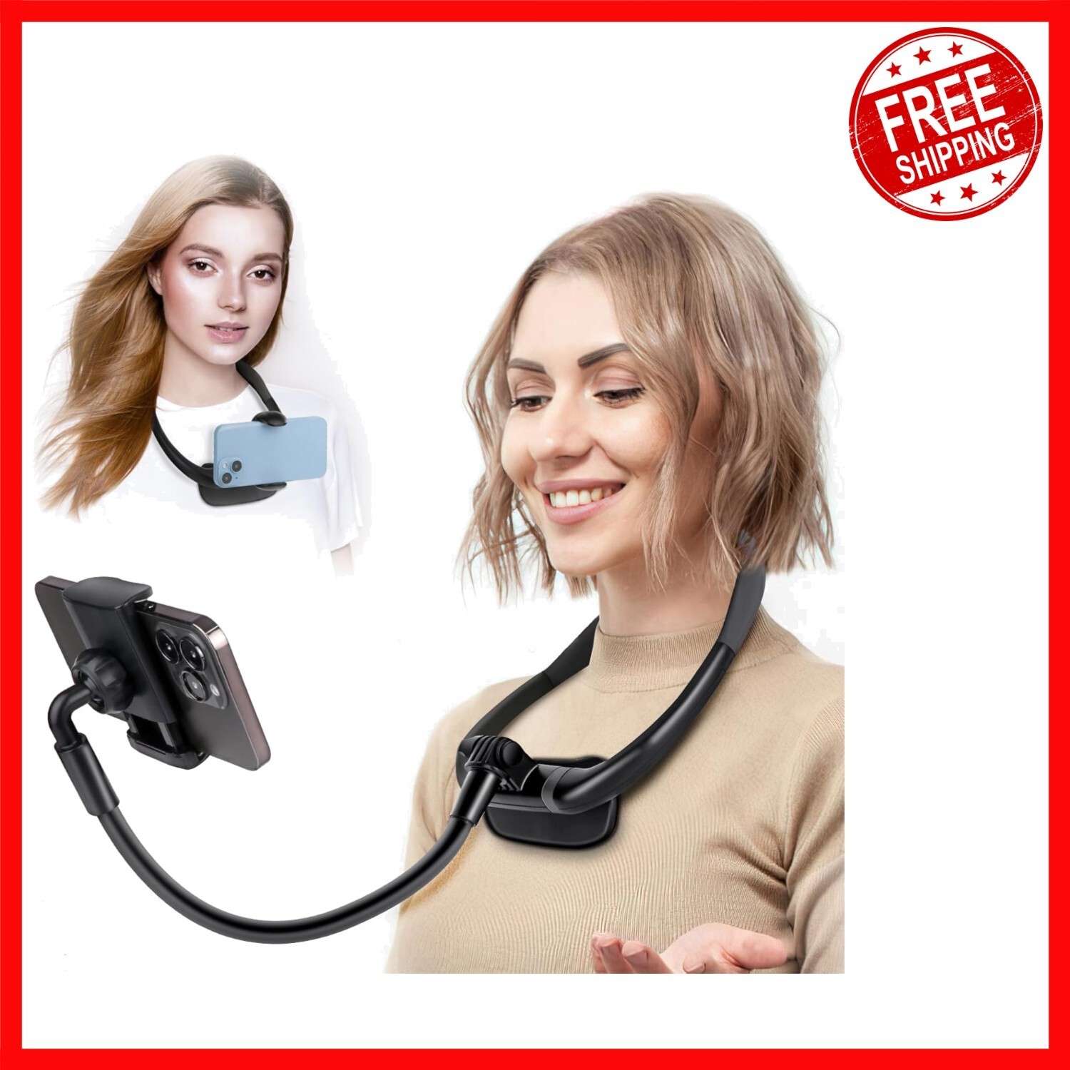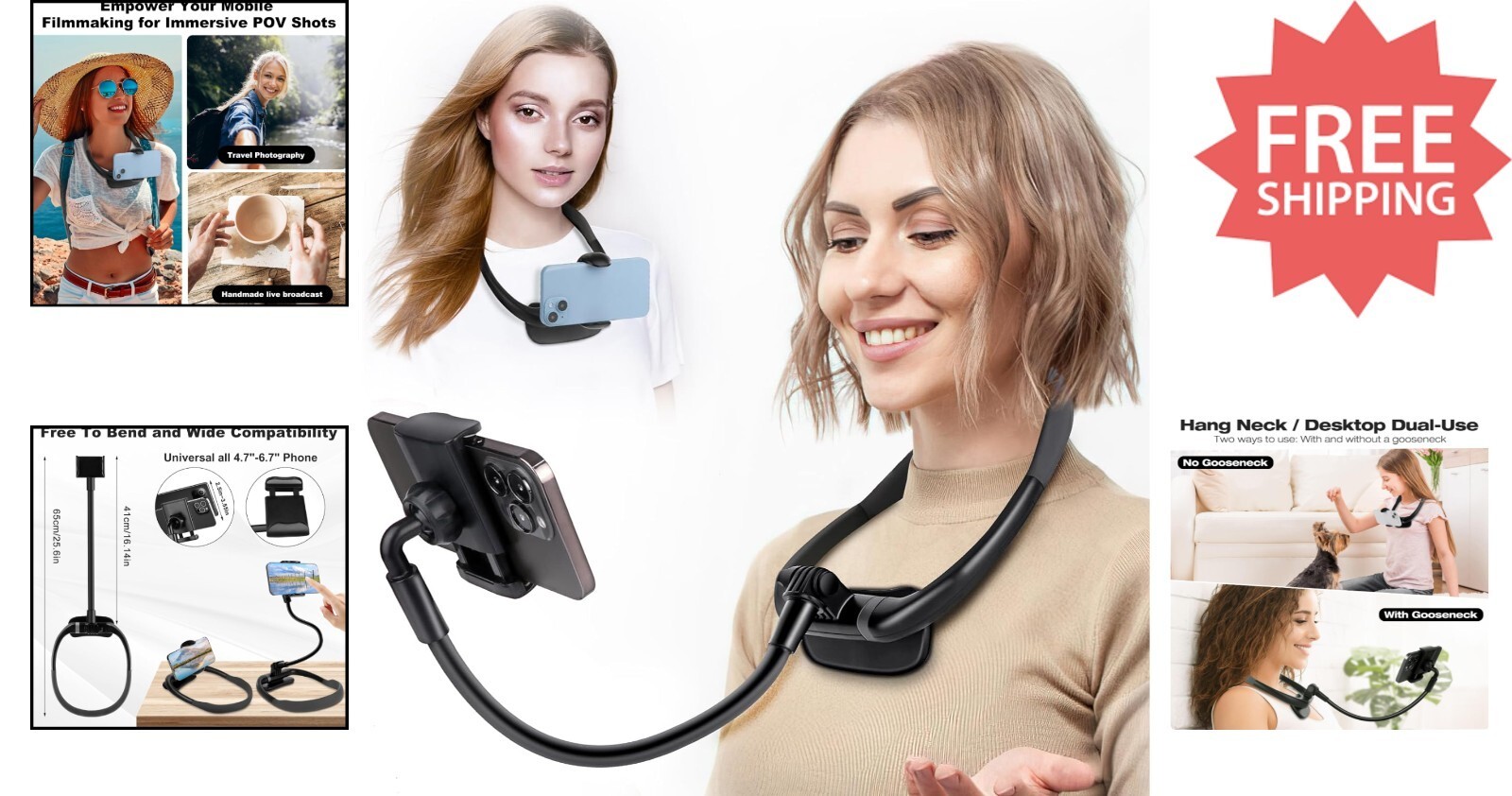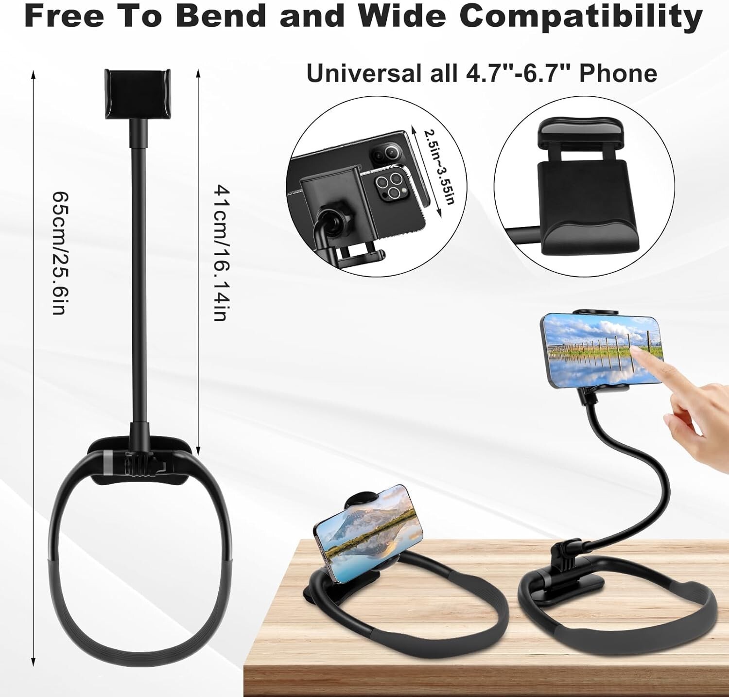 Experience unparalleled versatility with our adjustable phone neck holder, designed for ultimate convenience and hands-free support. Featuring a flexible swan neck stand, it molds into any shape to fit your viewing preferences, offering 360-degree rotation and seamless switching between horizontal and vertical modes. Perfect for use on bed, sofa, or desk, and easily adjustable for various angles, whether you're shooting vlogs, browsing, or watching content. Lightweight and portable, it can be worn around the neck or mounted on your steering wheel, making it ideal for outdoor adventures, sports, or daily activities. Crafted from over 70% aluminum alloy with soft silicone padding for stability and comfort, this holder comfortably accommodates phones from 4.7 to 6.7 inches in width. Its versatile design includes options for gooseneck or no-gooseneck setups, ensuring reliable support wherever you go.