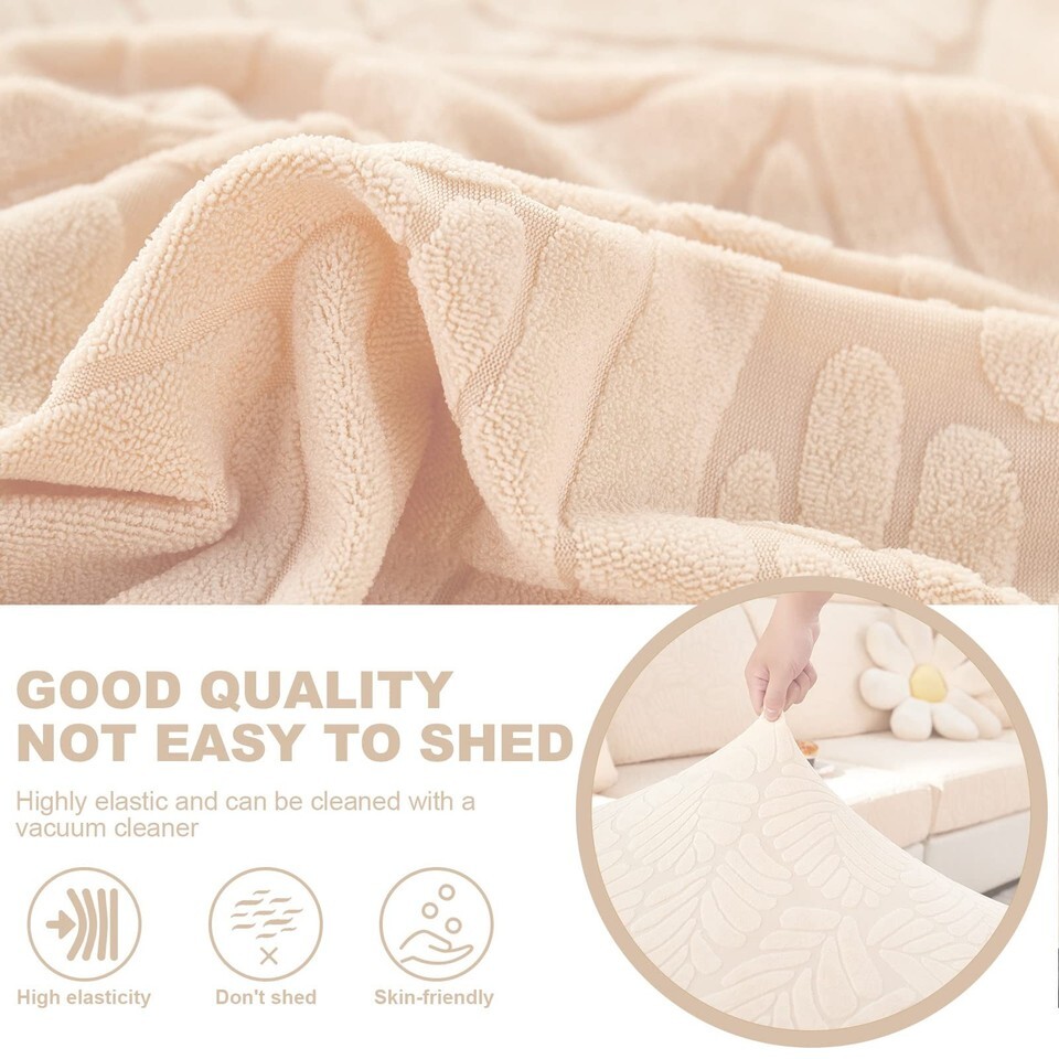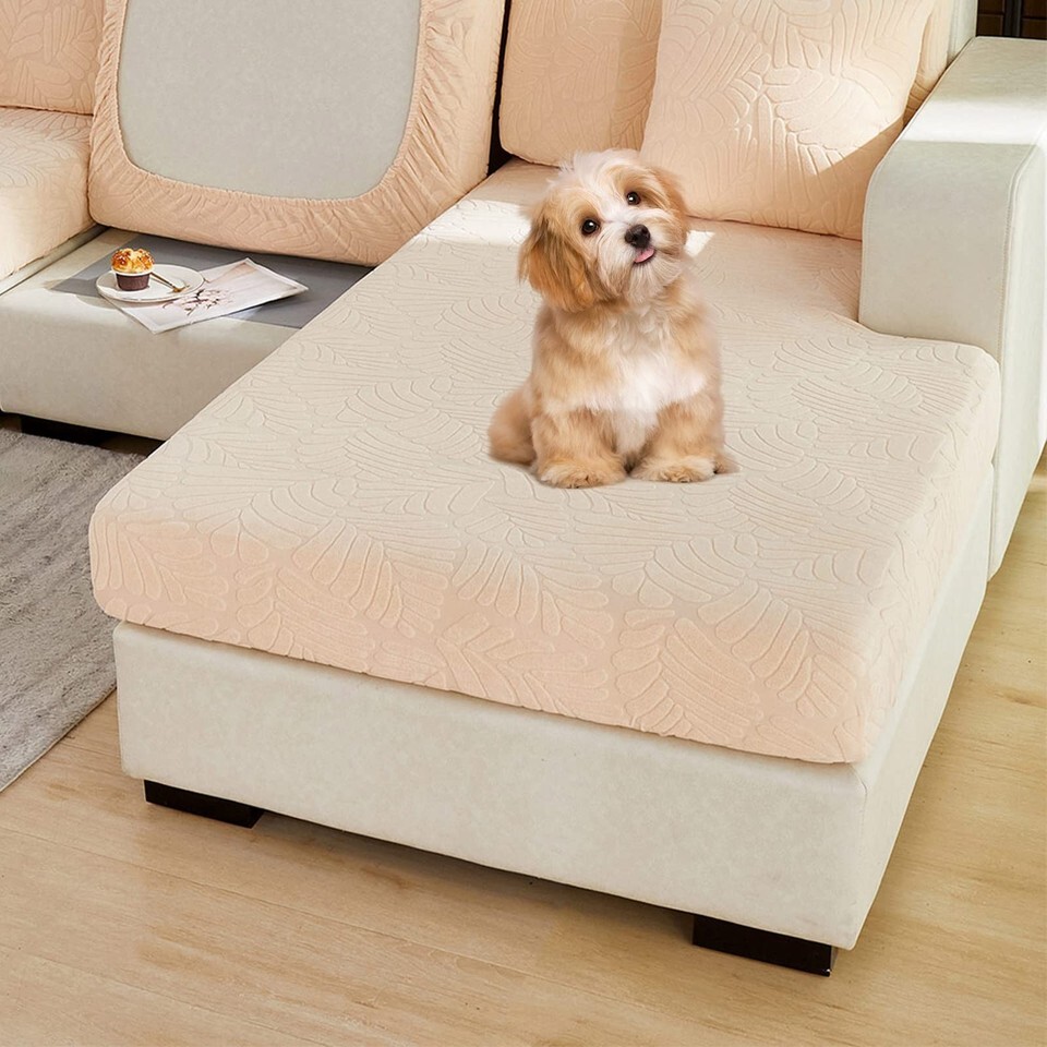 Water-repellent polyester spandex material with elastic hem for snug fit on L-shaped sofas