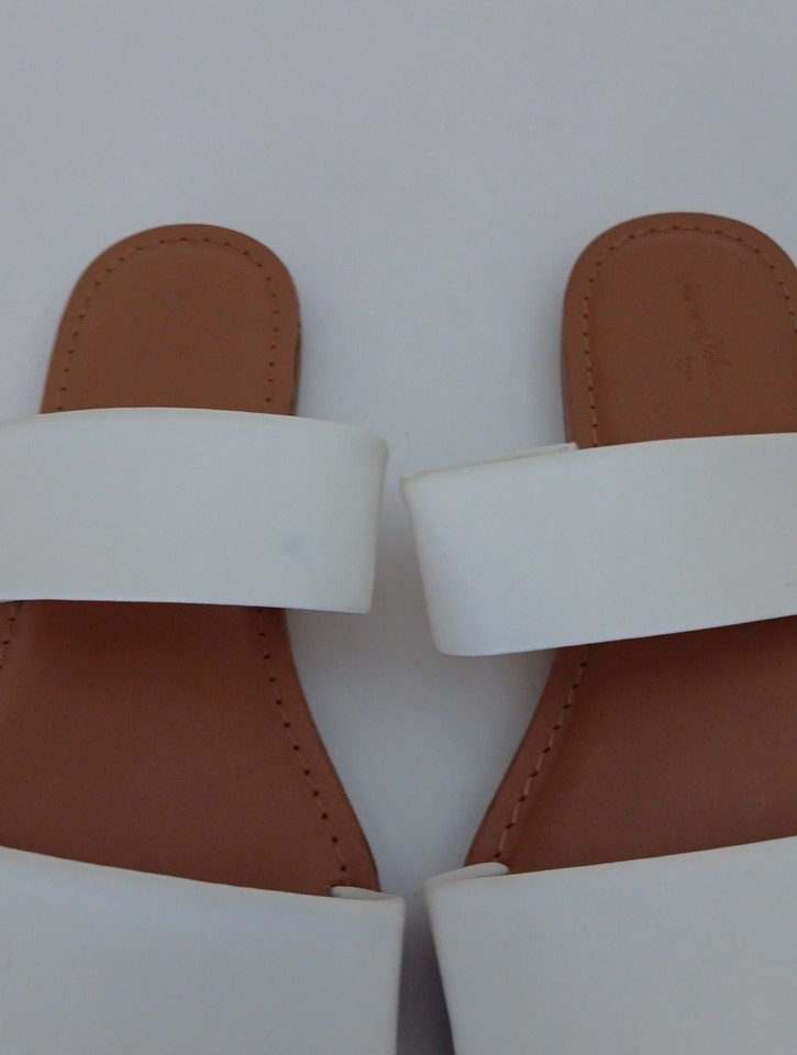 The product is a pair of Universal Thread Women's Sandals in size 7.5 in cream off white color. These sandals feature an open toe design, flat heel, and medium width. They are designed specifically for women and are from the brand Universal Thread. With a stylish and comfortable design, these sandals are perfect for everyday wear or casual outings. Light wear.