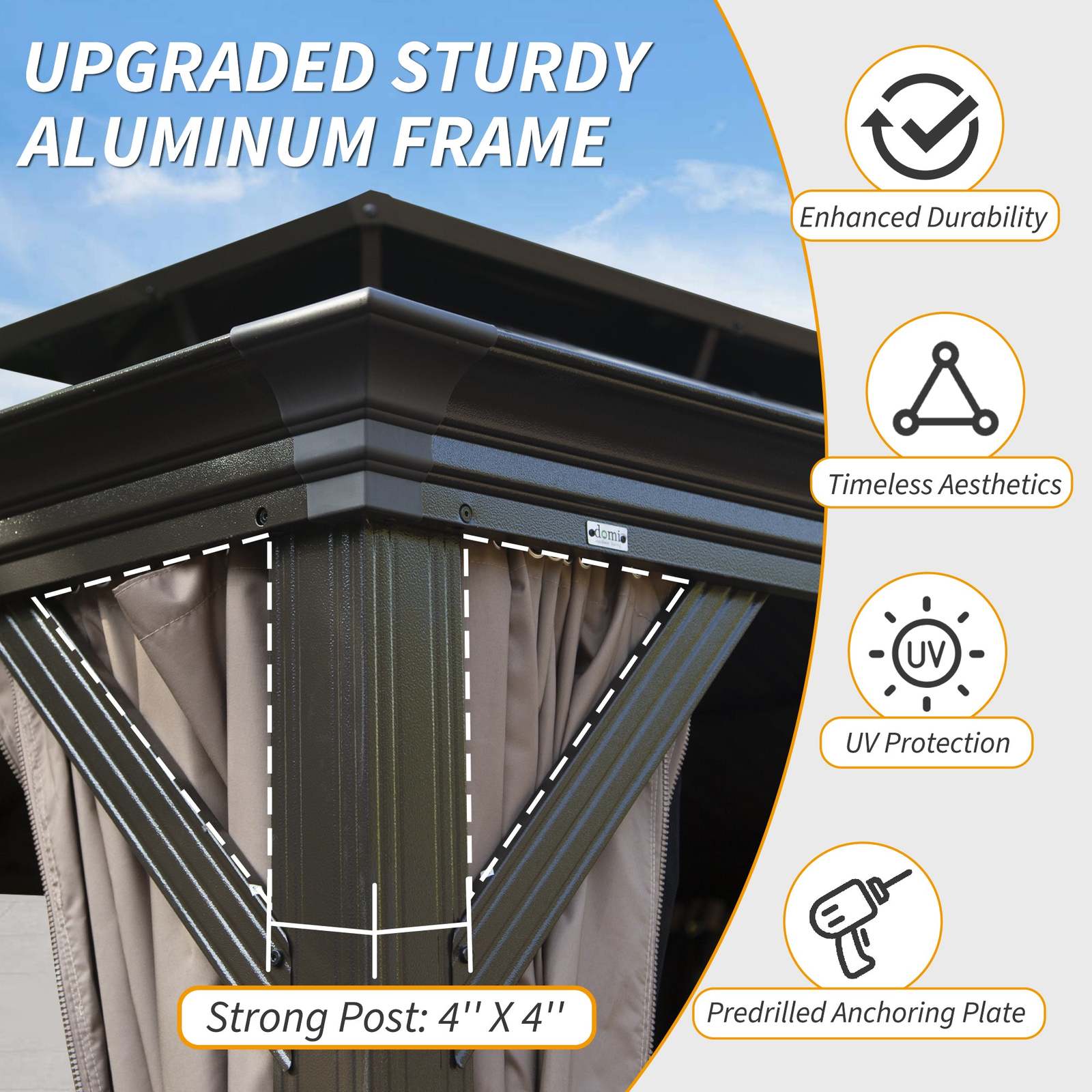 [Aesthetic Anchoring and Stability] The included cover for anchoring bases not only protects the bolts but also enhances the gazebo?s visual appeal. For added stability, the structure should be anchored with concrete piles (bolts are not included), and detailed instructions are provided for easy setup.