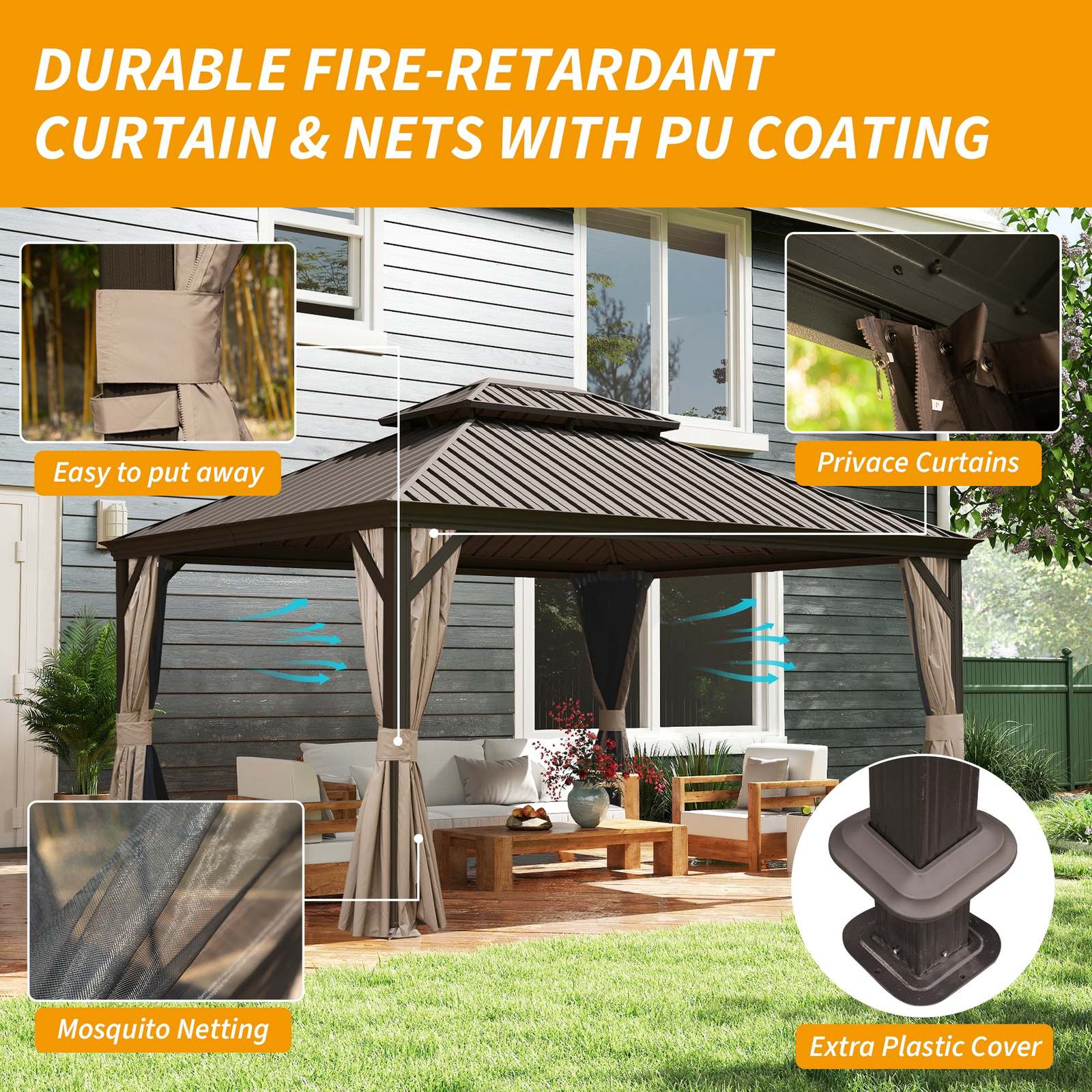 [Complete Privacy and UV Protection] Equipped with fade-resistant, waterproof curtains and breathable netting, this gazebo canopy offers superior privacy and protection from UV rays while keeping insects at bay. The smooth double-track system allows for easy adjustments, making it simple to tailor your space to your needs.