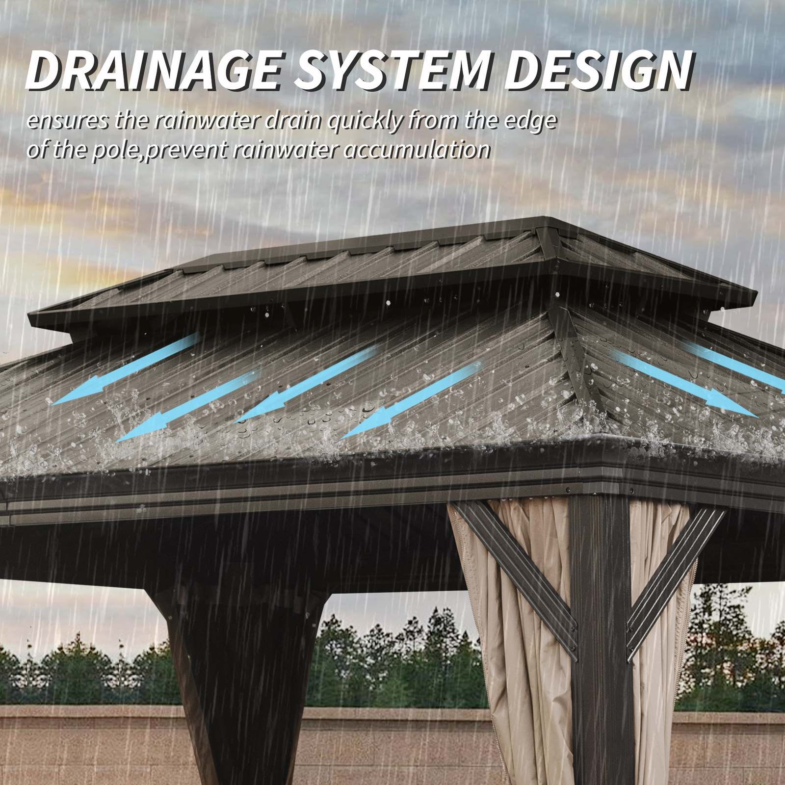[Built-in Drainage System for a Dry, Comfortable Space] This metal gazebo features an innovative built-in drainage system that channels rainwater away, keeping your space dry and comfortable, even during rainy days. No more interruptions from rainfall?enjoy uninterrupted outdoor relaxation and entertainment all year long.