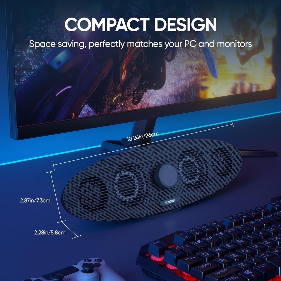Space-Saving Design: With dimensions of 10.2? x 2.8? x 2.3?, this sleek and low-profile speaker fits effortlessly beneath monitors or within tight desk confines.