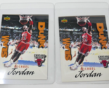 This is a pair of vintage 1997-98 Upper Deck Nestle Slam Dunk Michael Jordan trading card featuring the iconic Chicago Bulls player. These come in a plastic sleeve.