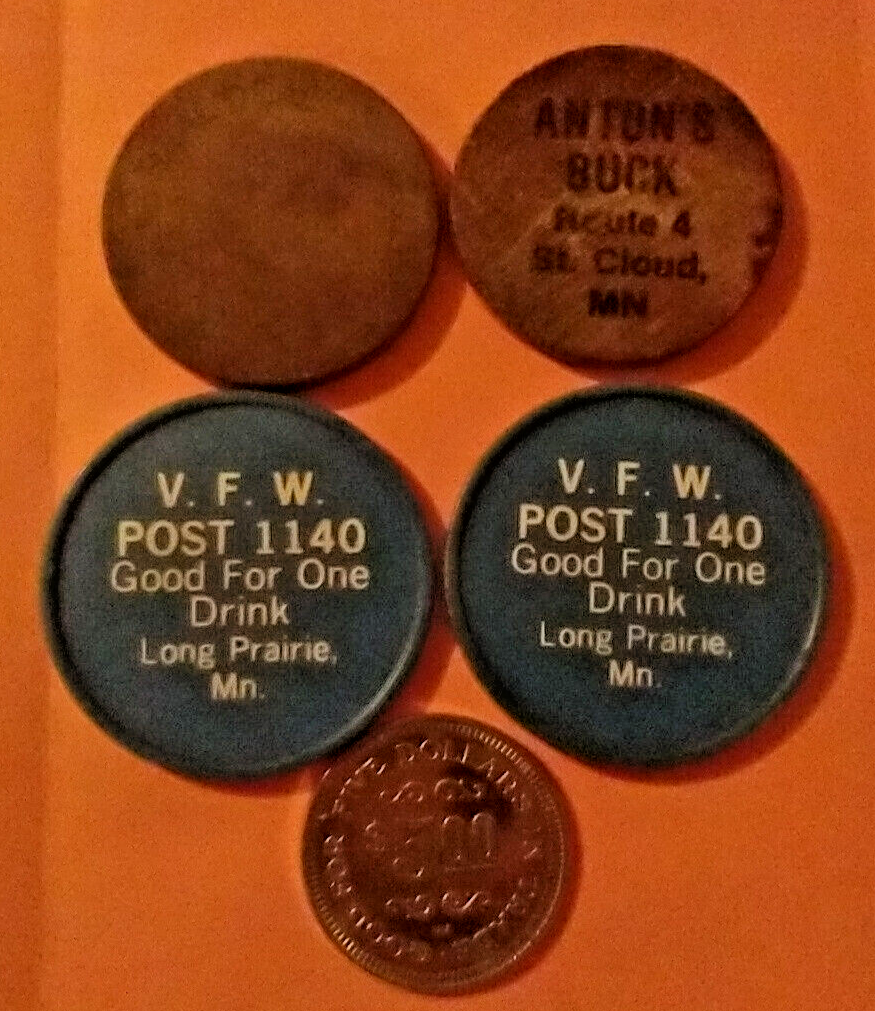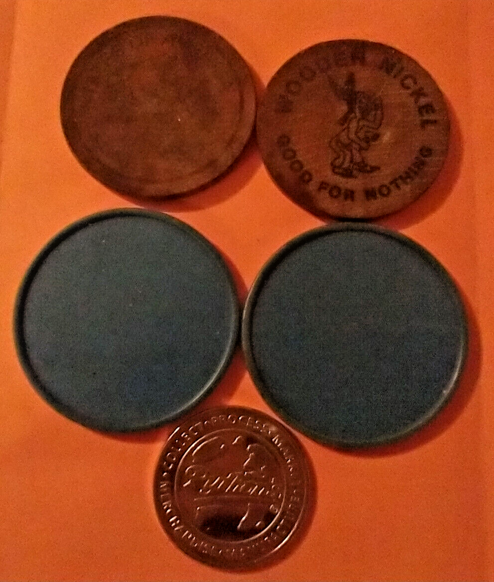 BLUE PLASTIC V.F.W. TOKENS MADE OF PLASTIC AND ABOUT 1 5/8" WIDE, ANTON'S BUCK WOOD NICKEL ABOUT 1.5" WIDE, BADLY FADED WOOD NICKEL SAYS UNITED STATES OF AMERICA WITH A BUFFALO ON FRONT AND REAL DEAL SOMETHING (CAN'T MAKE OUT THE REST) ON BACK AND ABOUT 1.5" WIDE, PYTHON'S $5 TOKEN ABOUT 1 1/8" WIDE AND NON-METALLIC. SOLD AS-IS NO RETURN.