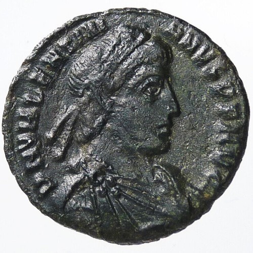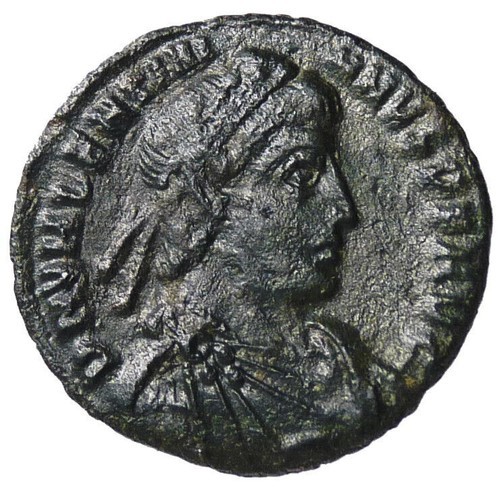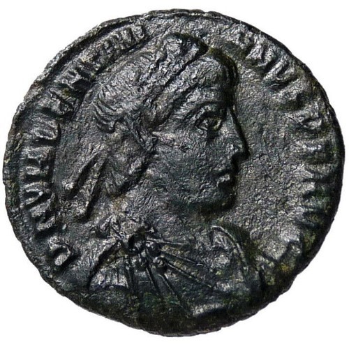 Obverse: DN VALENTINIANVS P F AVG PF AVG--translation: "Dominus Noster Valentinian Pius Felix Augustus" (Our Lord Valentinian pius happy Augustus),