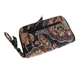 This fabulous wallet is from Vera Bradley and features the Fall 2007 Kensington Brown pattern. It features a full zipper closure, card and ID slots, billfold and money storage and a wristlet strap. It has the signature Vera Bradley cotton quilted exterior and zipper pulls. It has an additional zippered compartment on the backside.