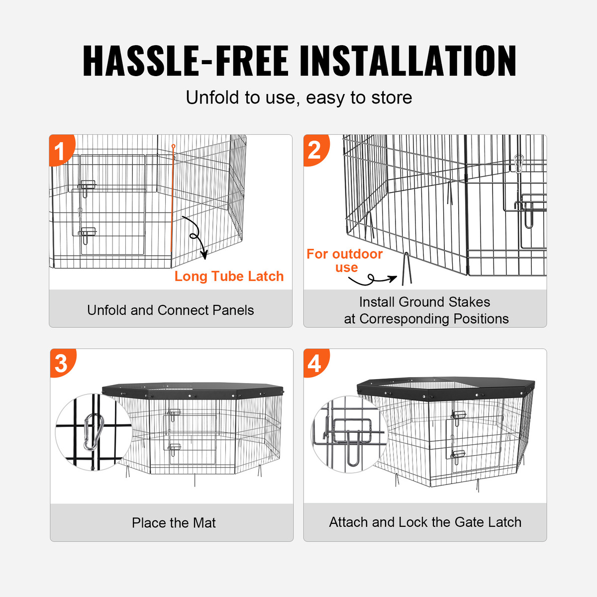 Sturdy Enclosure to Avoid Pet Escapes: This puppy pen includes 8 ground stakes of 3.9" / 100 mm each to firmly anchor it in place. With 2 gate latches, 16 tension straps, and 1 carabiner clip, it prevents pets from opening the gate and escaping. Crafted from robust metal, it withstands pets' play and bites, freeing you from constant supervision.