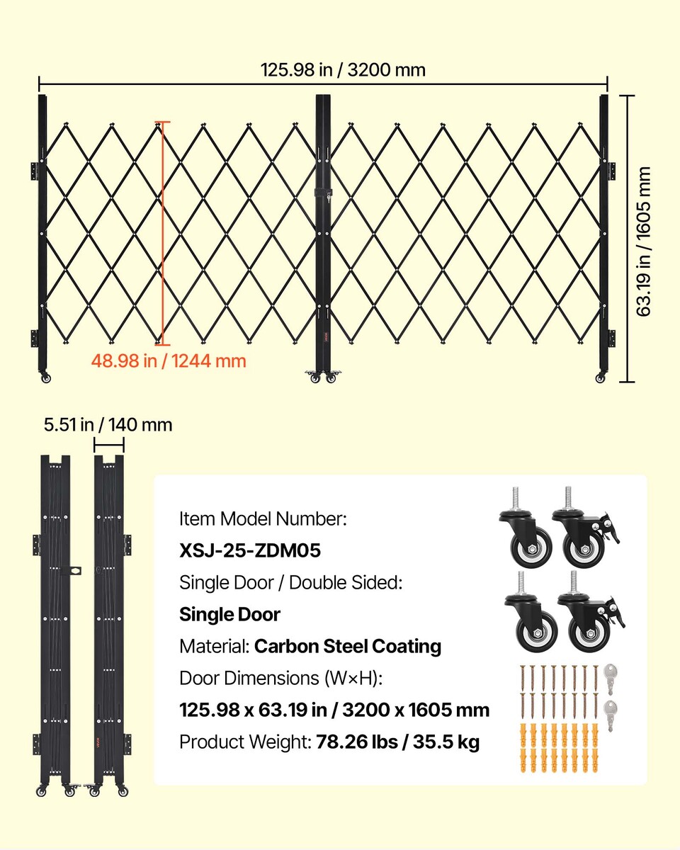 Retractable Folding Gate: The folding gate uses a retractable width structure. Maximum unfolded size: 125.98 x 63.19 in (W x H). Minimum folded width: 5.51 in. This standard size fits security doors, protective barricade gates, and defense facilities.