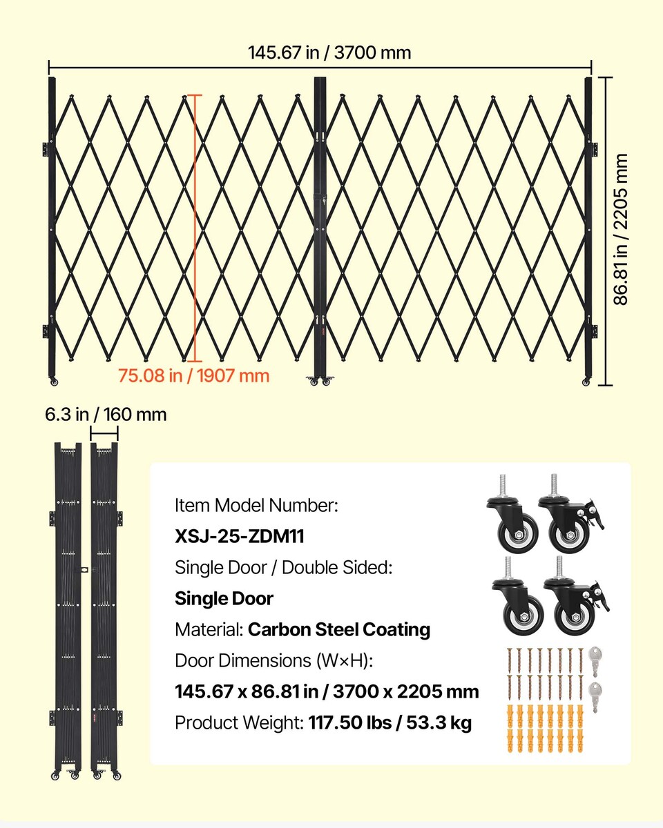 Retractable Folding Gate: The folding gate uses a retractable width structure. Maximum unfolded size: 145.67 x 86.81 in (W x H). Minimum folded width: 6.3 in. This standard size fits security doors, protective barricade gates, and defense facilities.