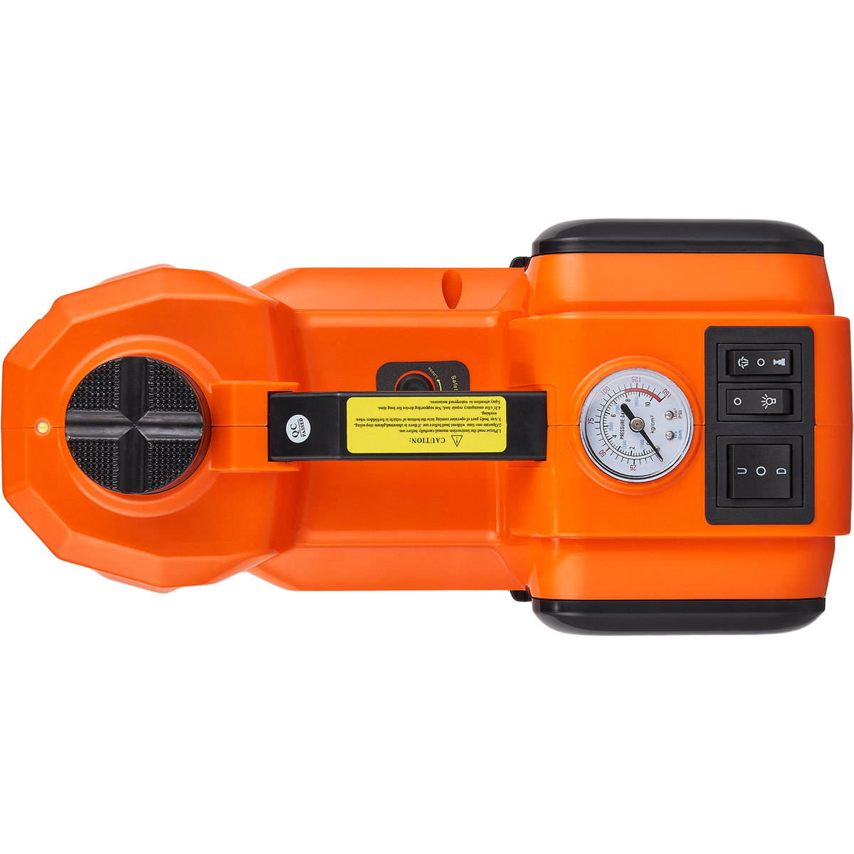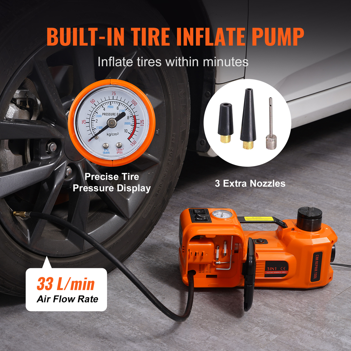 Quick Tire Inflation: With a tire inflator pump installed in the electric hydraulic car jack, there is no need to worry about a tire-broken emergency in the middle of nowhere. Hidden toolboxes on both sides keep the inflatable tube and inflatable needles for quick tire inflation well organized. Equipped with a tire pressure display, you can monitor the tire pressure while pumping. Your car says thank you!