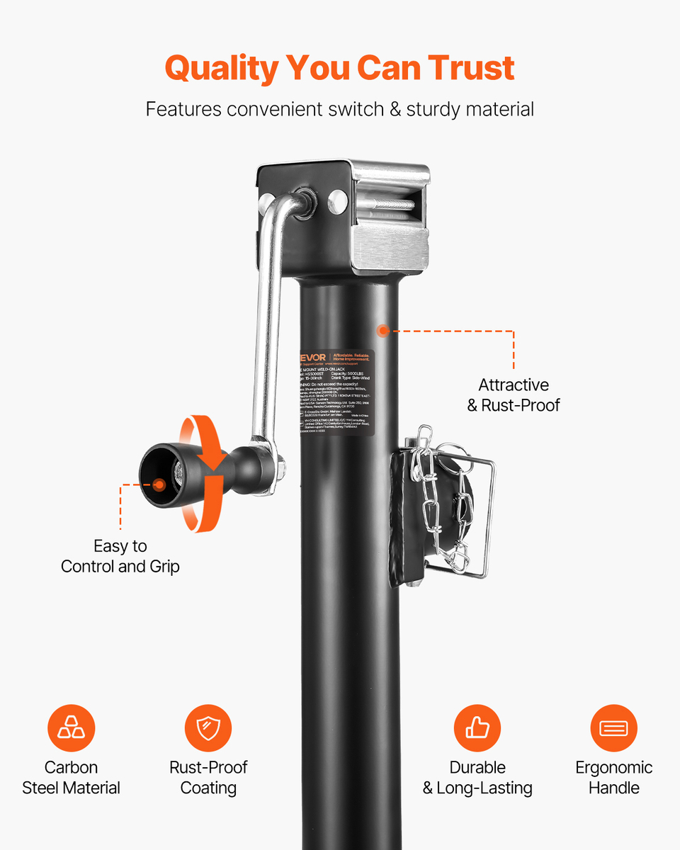 Flexible Compatibility: Designed with a wide lifting range, our utility trailer jack works for all kinds of trailers, big or small, high or low. It's built for flexible, everyday use to make your life easier.