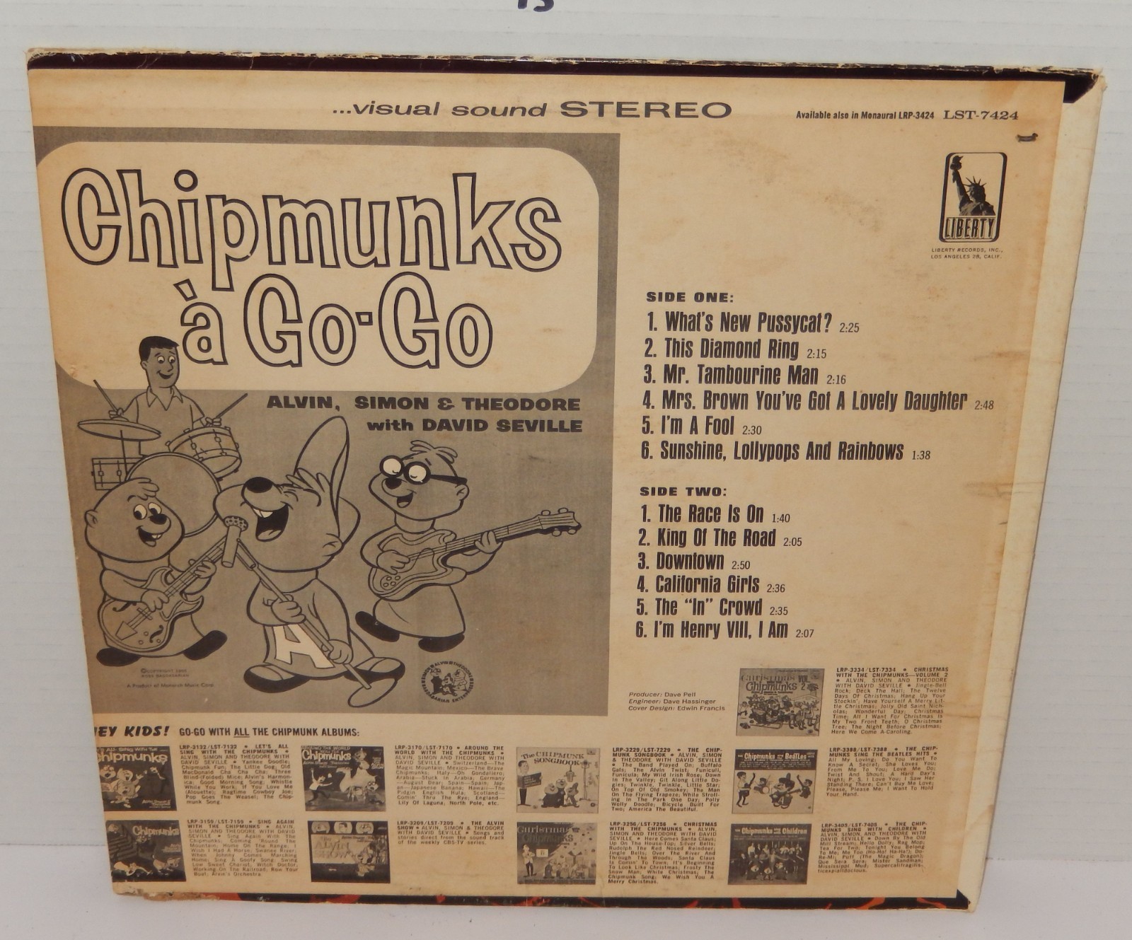 For Sale for a VINTAGE 1965 Chipmunks A Go Go LP Vinyl Record Album LRP3424 Alvin Simon Theo In G to VG USED condition Has been play graded. comes as pictured. Please ask Any and All Questions prior to purchasing. Fast Same or Next day shipping with Free Delivery Confirmation within the U.S. Payment Due within 7 days of purchase (if you need more time please let us know In advance) we love to combine shipping is always a Yes and Most of the time Additional Items Ship for free.