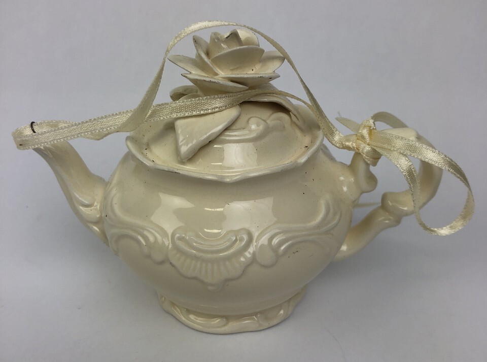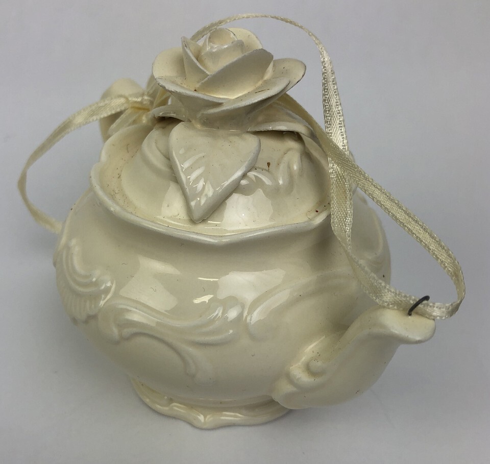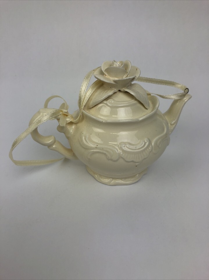 - VINTAGE 1998 Mud Pie Victorian Rose Ivory Porcelain Teapot Ornament - Rare Find