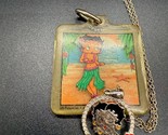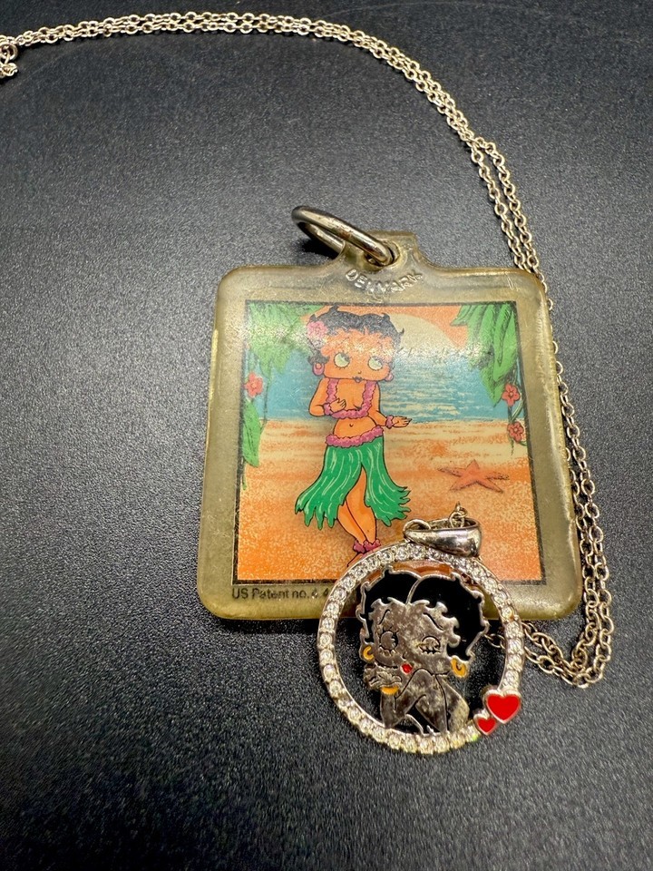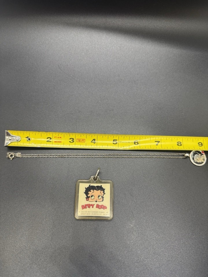 This 1994 product is a vintage rare Betty Boop necklace and keychain set. This collectible item features a rhinestone necklace with a classic Betty Boop design and a double sided keychain with different scenes on each side, making it a unique and nostalgic piece of animation merchandise. Perfect for fans of the beloved cartoon character, this set brings a touch of retro charm to any collection or outfit.