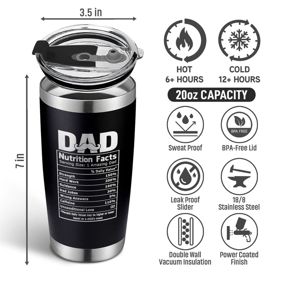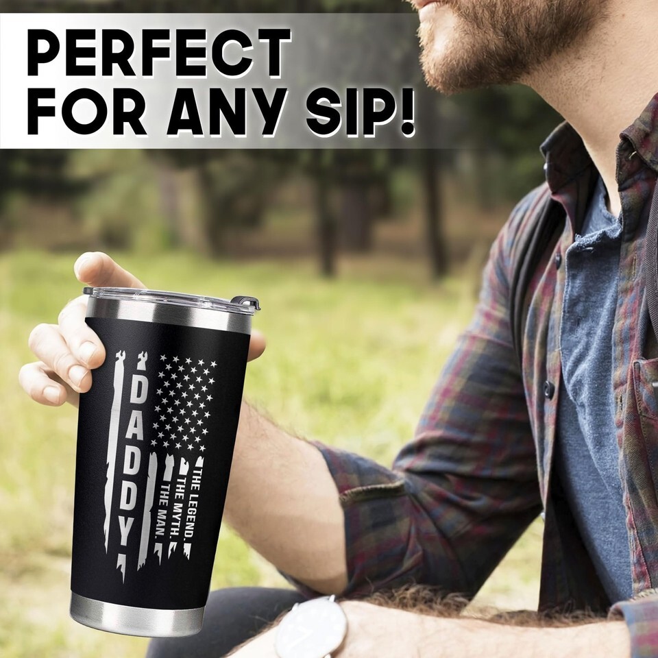 Stay Hydrated in Style with the Dad Tumbler 20oz! Introducing the Tumbler 20oz your perfect companion for any adventure! Crafted with premium stainless steel, this double-walled tumbler keeps your drinks hot or cold for hours. Its sleek, modern design fits comfortably in your hand and cup holders, making it ideal for travel. Whether you're sipping coffee on the go or enjoying iced tea at the park, the Tumbler combines functionality and style effortlessly. Elevate your beverage experience today!. Perfect gifts for dad, dad gifts, birthday gifts for dad, dad birthday gift, christmas gifts for dad, dad christmas gifts, fathers day gifts, fathers day gifts from daughter, fathers day gifts from son, fathers day gifts for dad. Its perfect for gifts for dad, dad birthday gift, dad gifts, birthday gifts for dad, gifts for dads birthday, dad gifts for birthday, new dad gifts, dad birthday gifts from daughter, father birthday gifts, christmas gifts for dad, dads birthday gifts ideas, best dad ever gifts dad birthday, fathers day gifts, dad gifts from daughter, dad christmas gifts, birthday gifts for dad from daughter, happy dad, funny dad gifts, gifts for dad from daughter, gifts for dad who have everything, gifts for dad who wants nothing, happy birthday daddy, presents for dad, father gifts, birthday for dad, dad birthday gift from son, funny gifts for dad, birthday presents for dad, cool dad birthday gifts, best dad gifts, dad presents for birthday, best gifts for dad, dad presents, dads birthday gifts, gifts for a dad. Leak Proof Say goodbye to spills with our leak-proof 20 oz tumbler. Designed to prevent any leakage, it's perfect for travel, work, or outdoor activities. Stay hydrated without any mess or fuss. High-Quality Printing Experience exceptional style with our tumbler's high-quality printing. Choose from a wide range of designs to suit your personal taste and make a statement wherever you go. Airtight Lid Seal in the freshness with our tumbler's airtight lid. Whether you prefer hot coffee or cold beverages, it keeps your drinks at the ideal temperature for longer enjoyment.
