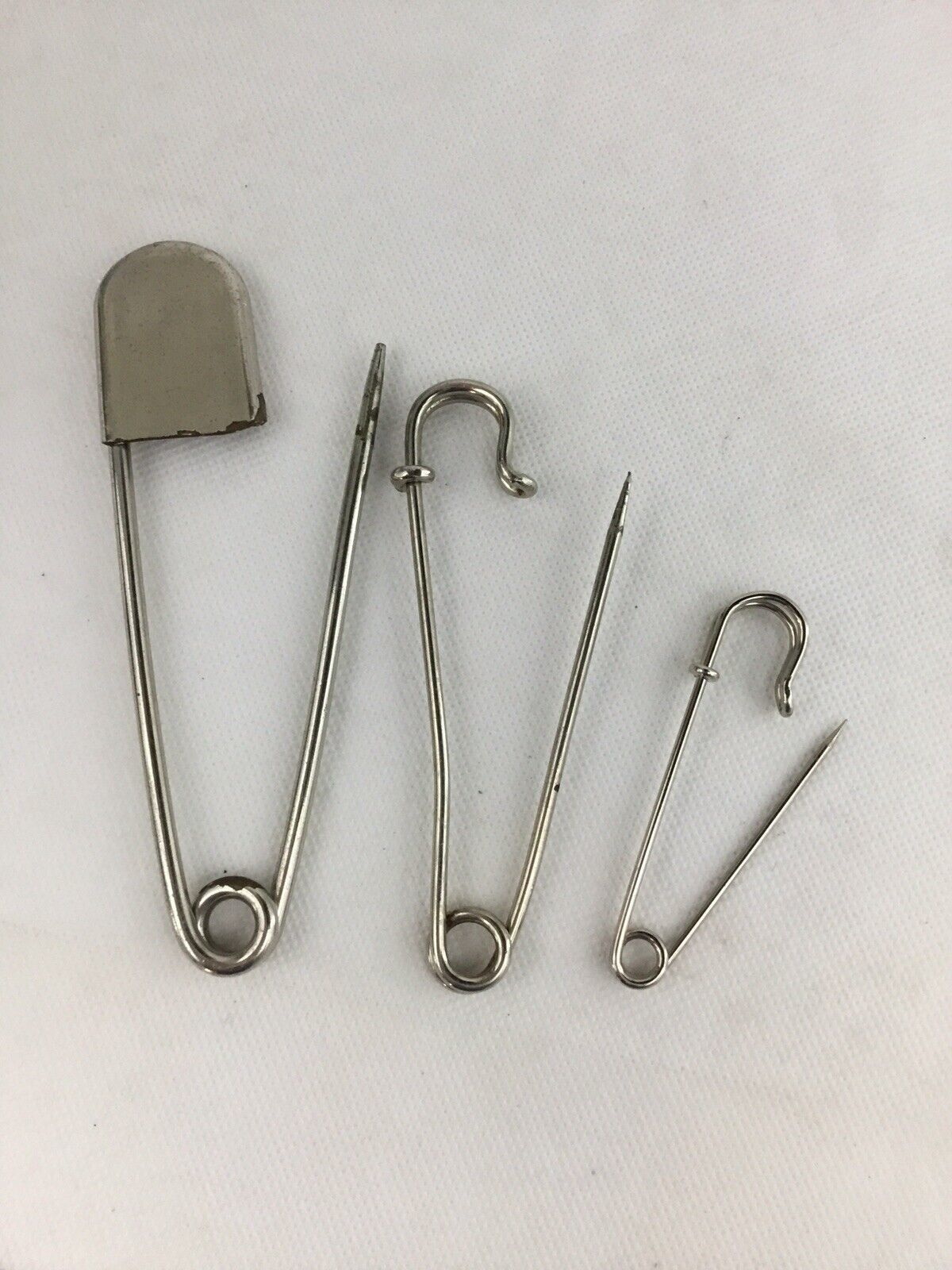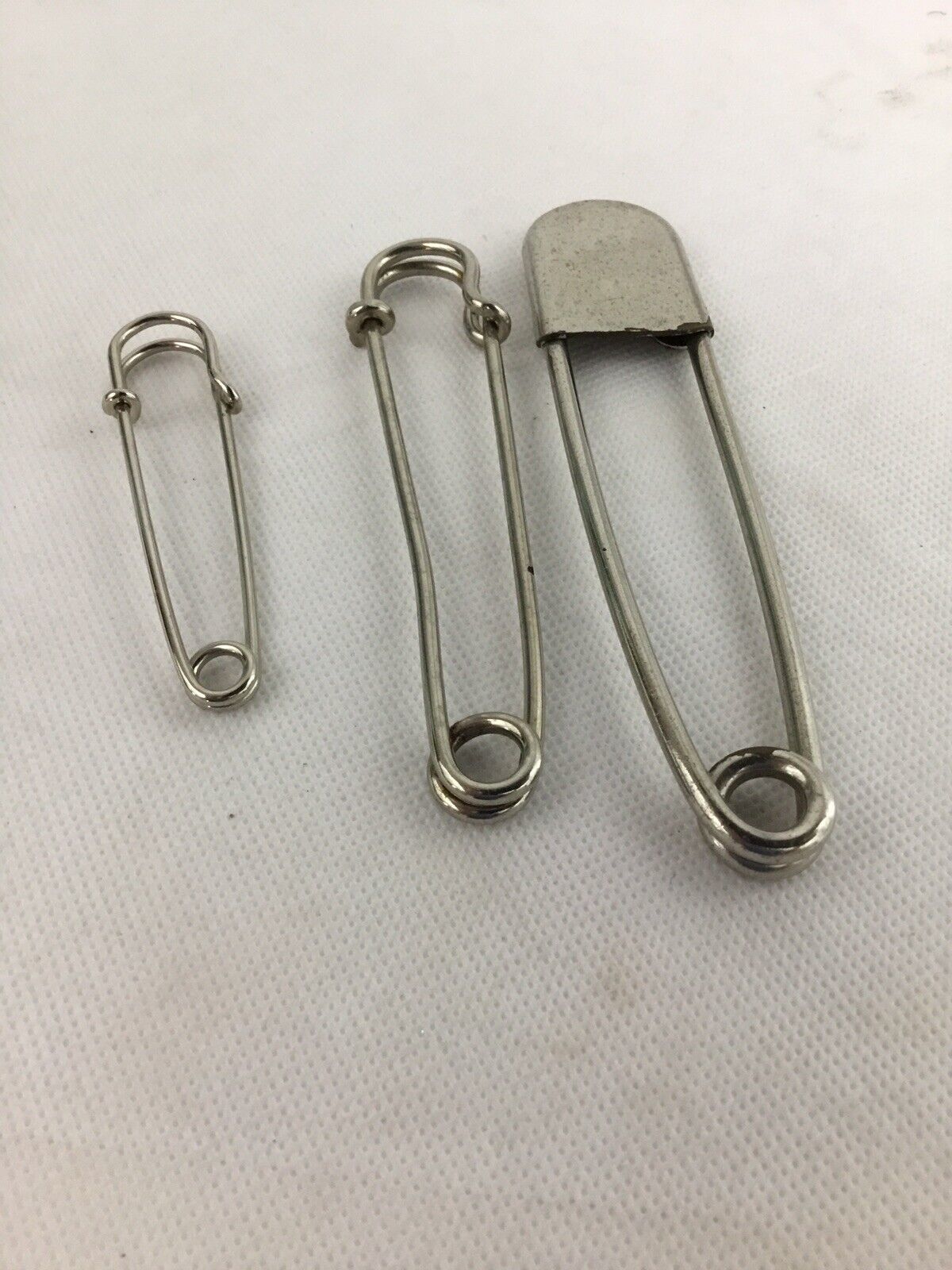 Set of 3 one large and 2 smaller, nice heavy metal, open and closes well. All silver tone, vintage and great condition . Strong pins