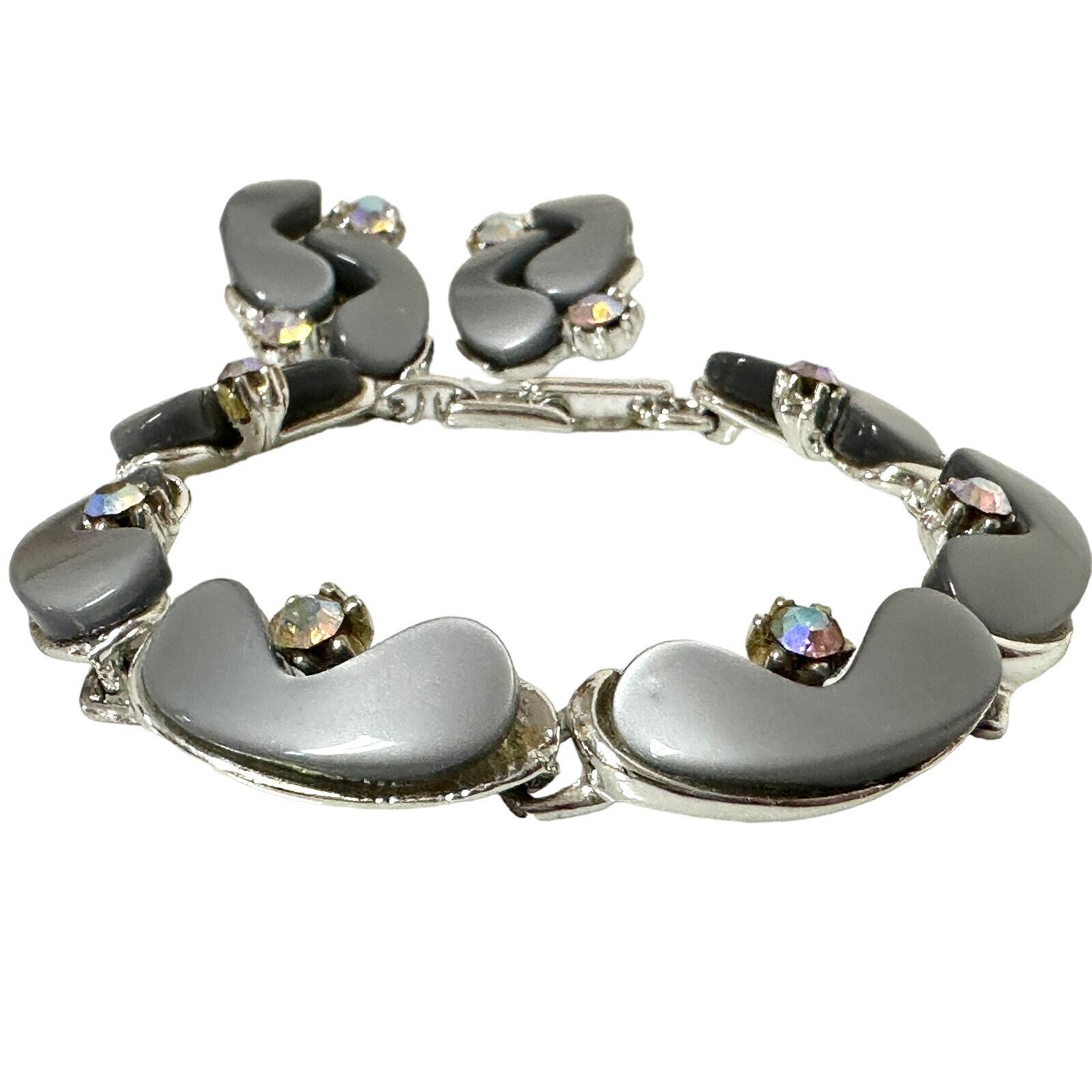 - VTG 1950s Thermoset Gray AB Rhinestone Bracelet Earrings Set Atomic Mid Century