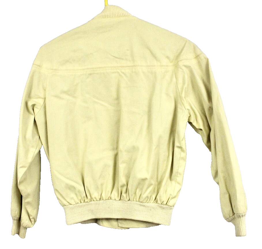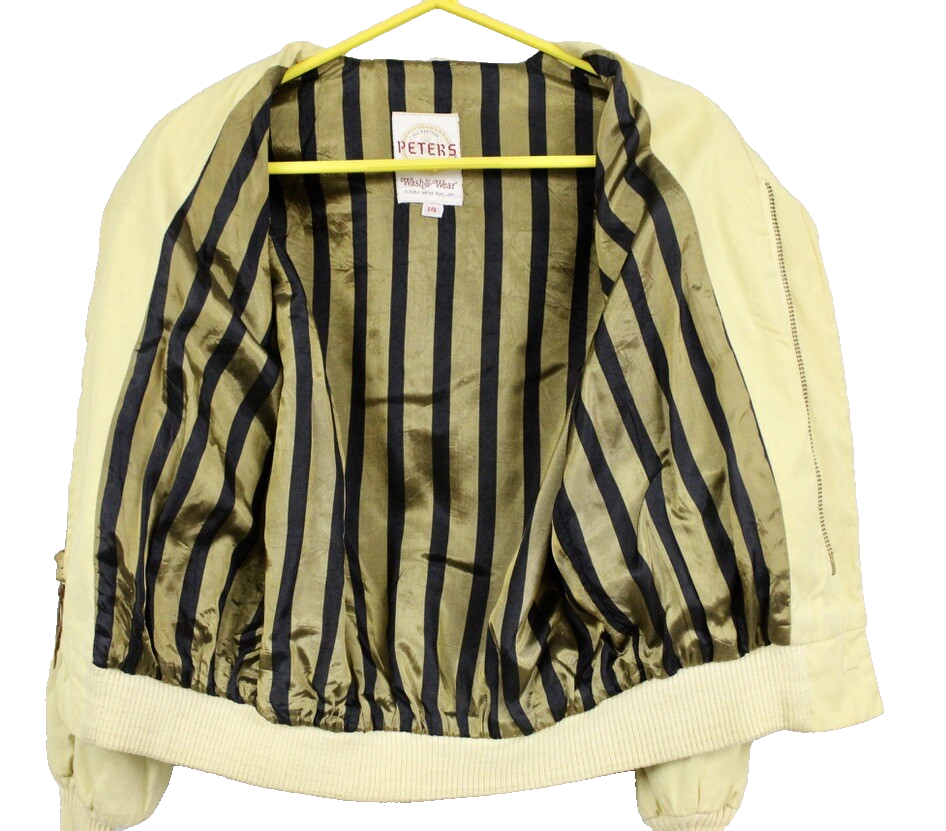 Peter?s was a mid-century American maker of rugged casualwear and utility jackets. This example reflects the postwar shift toward durable work-inspired clothing for both men and boys, with design cues borrowed from military field jackets and mechanic coats. Collectible today as heritage workwear and for its bold yellow shell and striped lining.