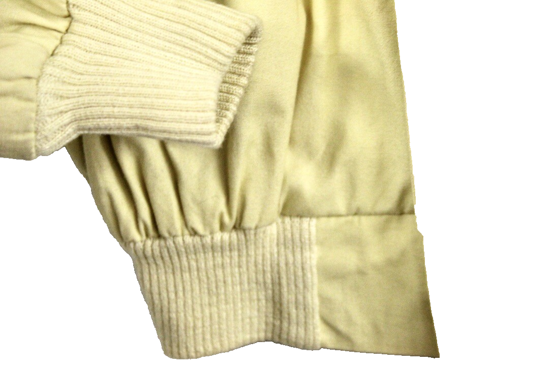 Yellow cotton outer shell; striped satin body lining; blue sleeve lining; knit shawl collar, cuffs, and waistband; zip front with button neck/waist closure; Peter?s label; marked size 38.