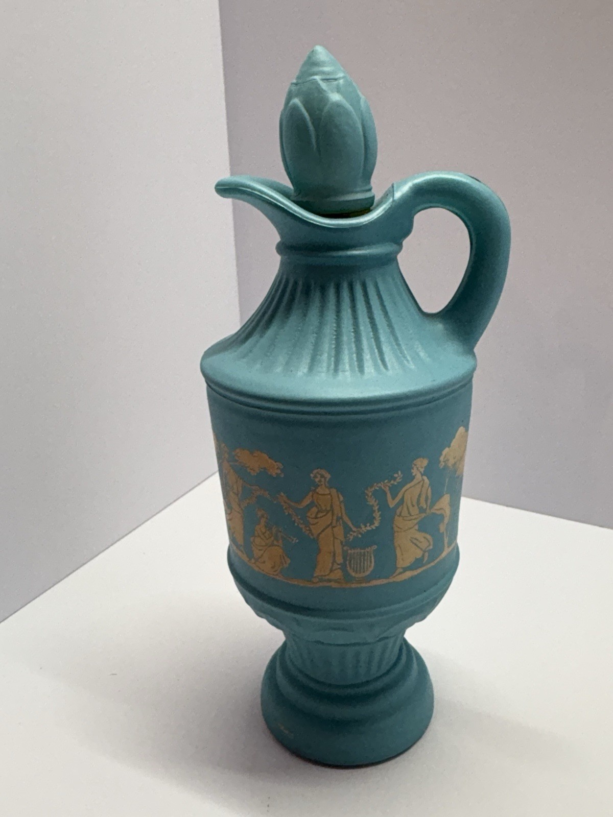 - VTG 1979 Avon Blue Frosted Glass Decanter Pitcher Cologne Bottle Mythology Scene