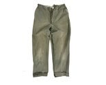 Provenance Note: Utility pants like these were standard for tradesmen and laborers in the 1940s, built of hardwearing cotton twill with gusseted reinforcement for freedom of movement. Surviving examples in green twill are scarcer than khaki, and collectors value their authenticity and rugged wear.