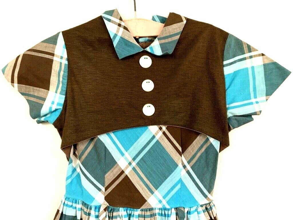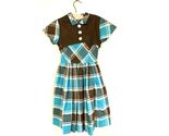 VTG 50s Cinderella’s Coach Plaid Girl’s Dress Brown Aqua White Vest Detail Sz
