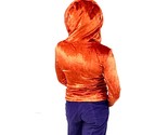 Vintage 1970s hippie rust-orange velour hoodie, junior women?s size XS (stretch fit). Shiny velour fabric with long sleeves, hood, and pullover styling ? a casual, yet eye-catching piece of 70s loungewear that crosses over easily into modern streetwear.