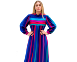 Vintage 1980s dress by Amy Adams, crafted in sheer polyester with vibrant green, blue, and pink stripes in true 80s color-block style. Features dramatic puff sleeves with elastic cuffs, layered yoke construction, and a full flowing silhouette that falls loosely from the yoke. Comes with a matching self-belt for styling versatility.