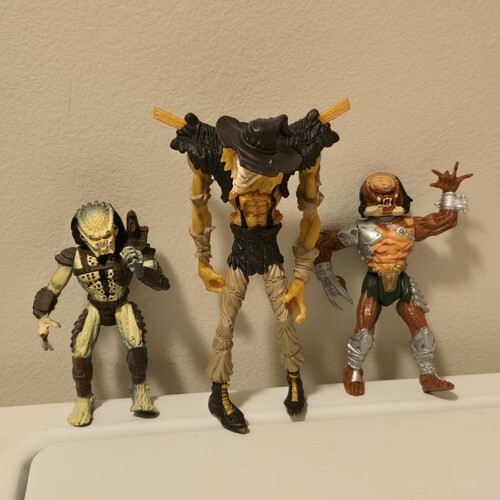 Vintage 90s Kenner Alien vs Predator 5.5" Renegade + 5.5" Cracked Tusk Predator + 90s Kenner 8" Twister Strike Scarecrow from Batman Legend of Dark Knight Action Figure Lot.
