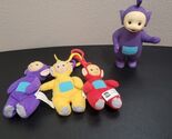 For sale is a vintage 90s Teletubbies plush toy keychain set of 3 from Burger King, along with a 6.5-inch Tinky Winky figure.