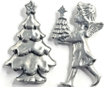 - VTG Angel Carrying Tree & Christmas Tree Pin Lot 2 Pewter Tone Holiday Jewelry