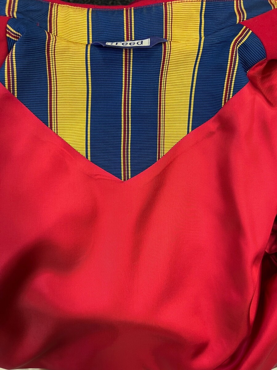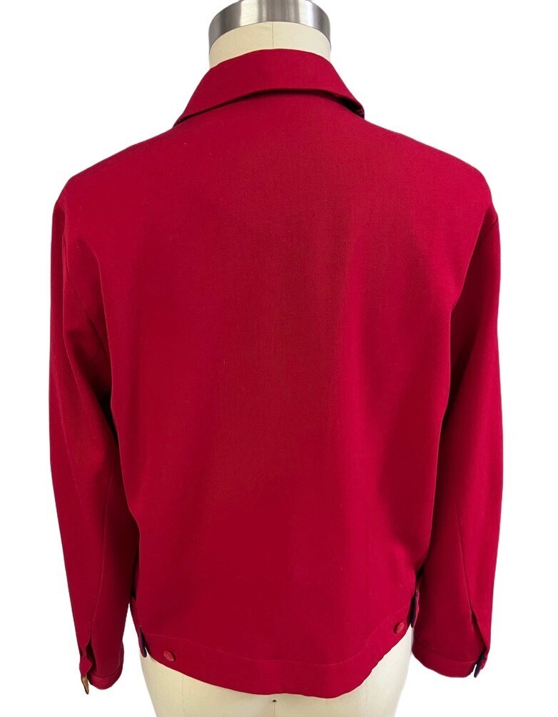 VTG Austin Reed Red Silk Blend Utility Jacket, Striped Quarter Lining Sz 10 Women UK- back of collar also has stripes. 2 slash pockets and one zippered chest pocket. It is in very good condition, but has light stains, that are imperceptible without a very close look.
