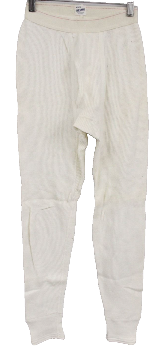 Vintage 1950s?60s cotton long underwear pants, likely big boys/teens size despite tag marked ?M 34?36.? Features two types of red striped elastic waistbands, button fly front, and classic thermal knit construction. Rare find in 100% cotton with excellent wearability.