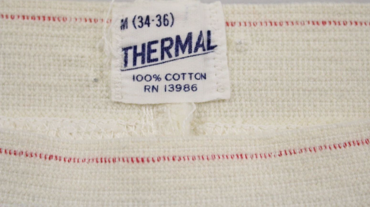 100% cotton thermal knit. Red striped elastic waistbands. Button fly.