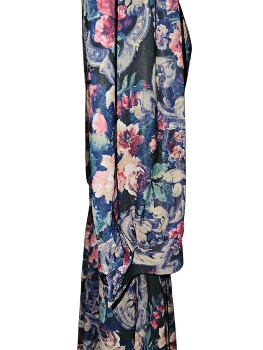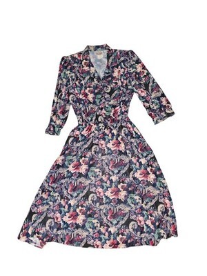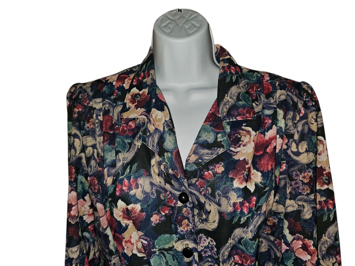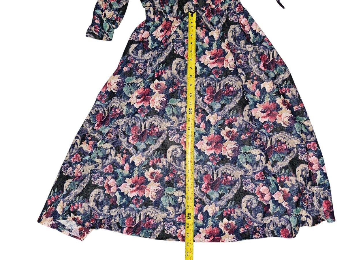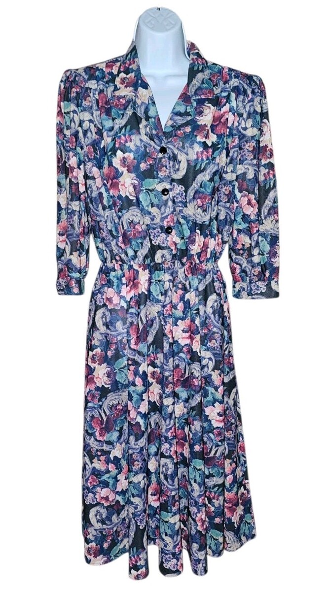 The VTG California Looks Elastic Waist Button Up Front Floral 3/4 Sleeve Dress 12 is a vintage piece from the 1980s designed by California Looks. This polyester dress features a mod/GoGo look with a colorful floral pattern and button-up front. Made in the United States, it is a one-of-a-kind original piece perfect for casual occasions, offering a unique and stylish option for women's vintage clothing.